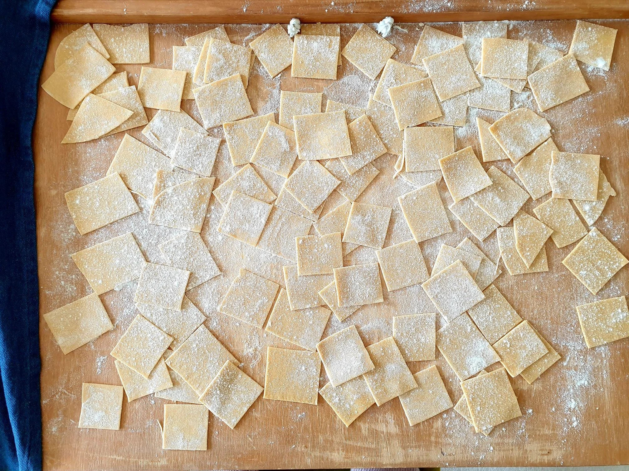Repeat the process with other pasta squares (during this process try to avoid a lot of flour as this will prevent the opposite sides of the pasta square to stick together).