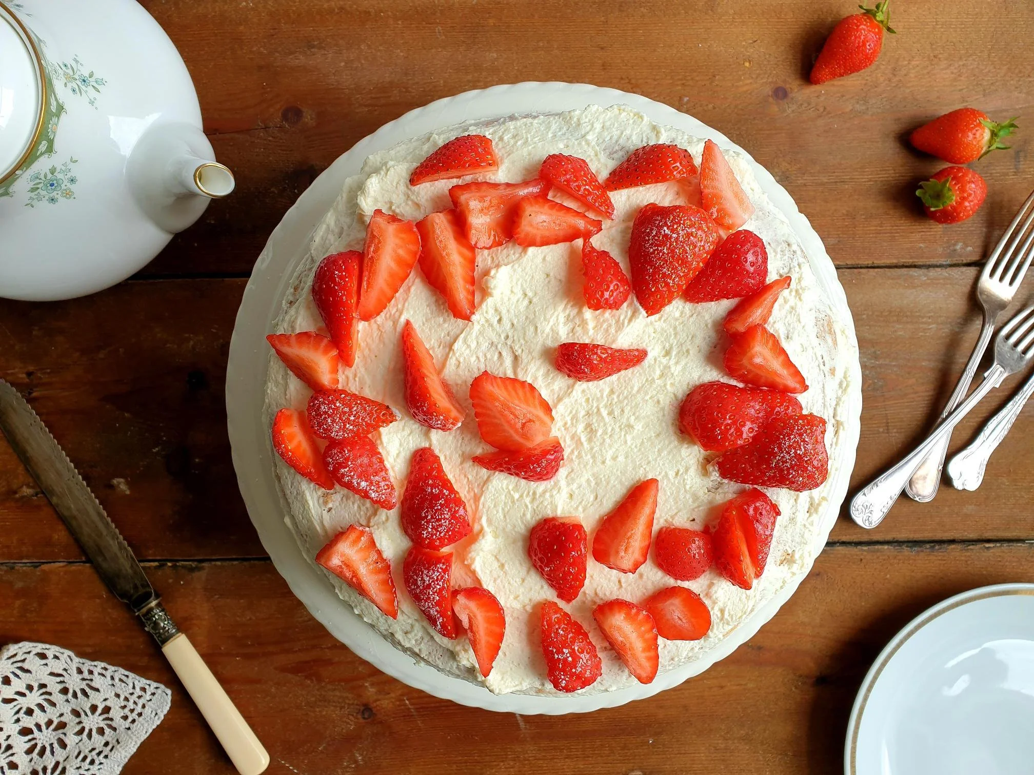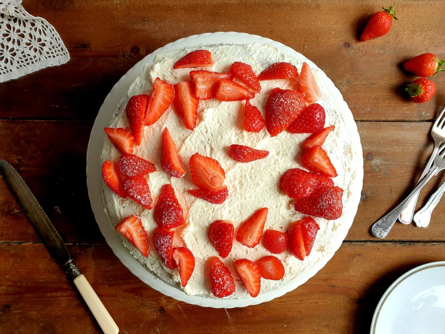 Decorate to your liking the top of the cake with fresh strawberries, sliced or left whole.