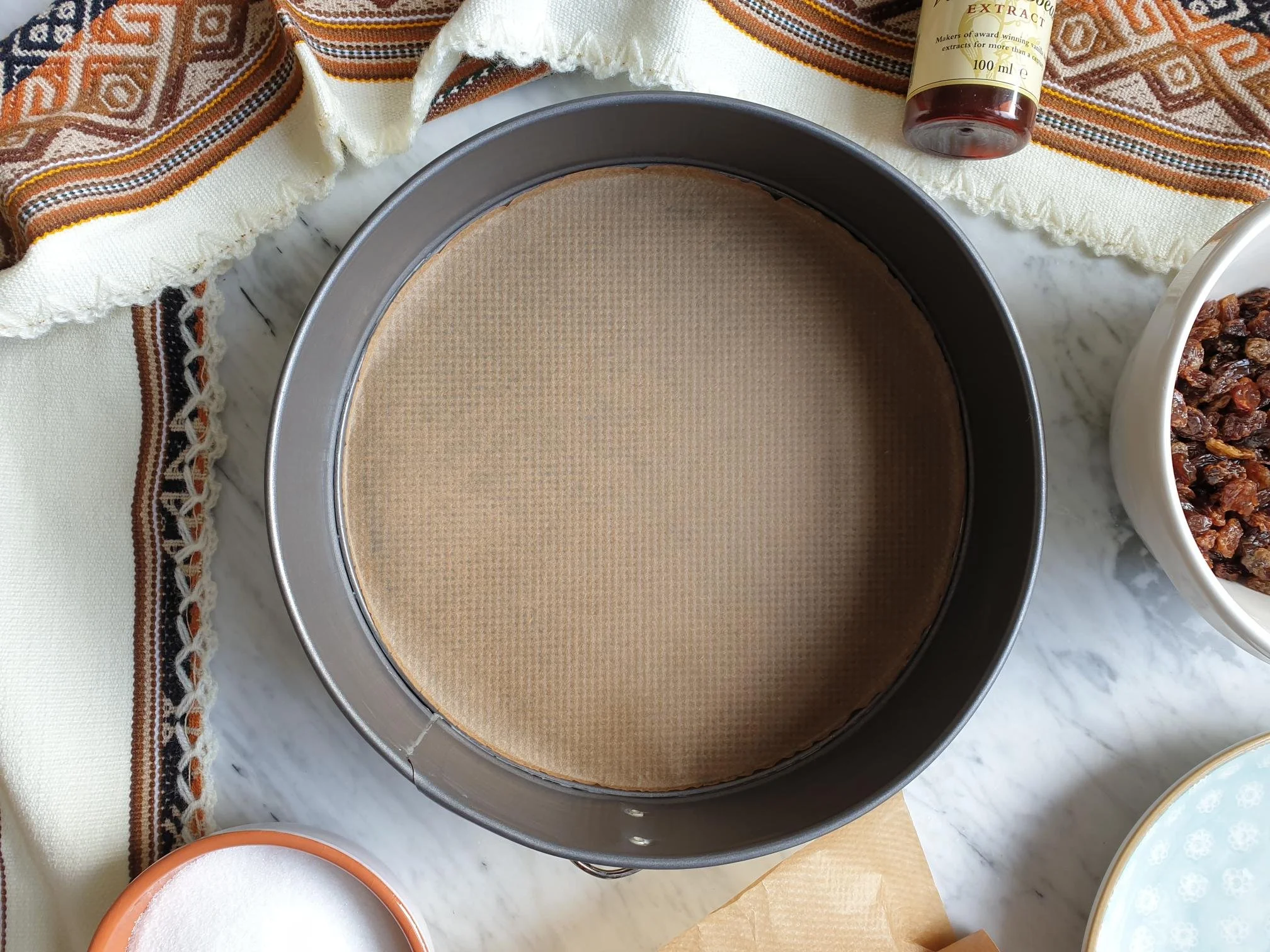 Lightly grease (I used butter) a 22cm (9in) loose-bottomed cake tin or spring form round cake tin and line the base with baking parchment.