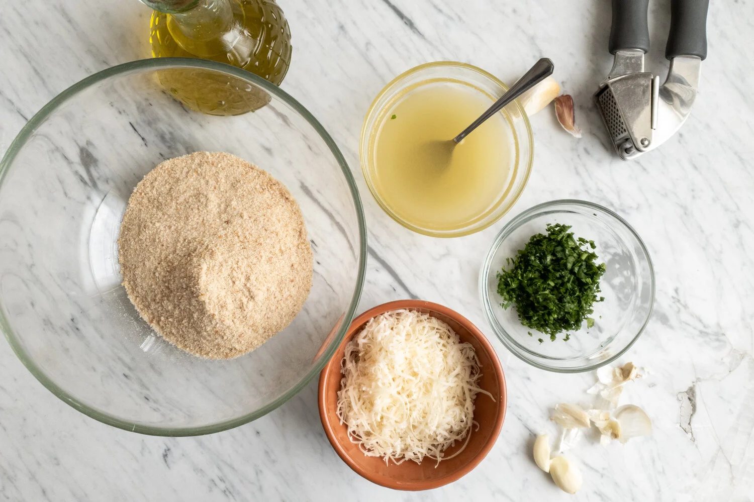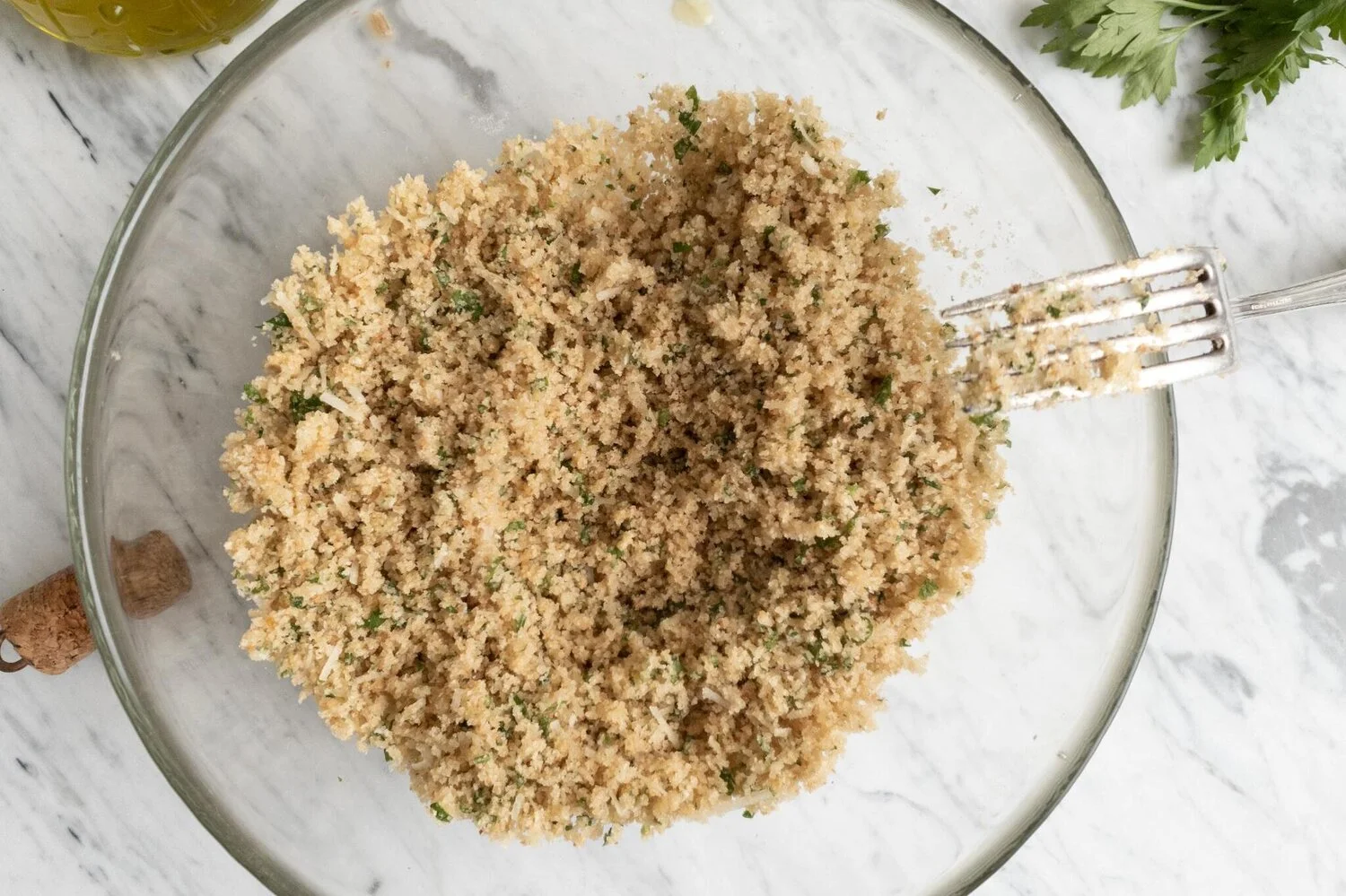 First of all, make the breadcrumb mixture. In a mixing bowl put the breadcrumbs, garlic, parsley, parmesan cheese and extra virgin olive oil. With the fork stir and mix so that all the ingredients combine well. You should end up with a moist breadcrumb mixture. Taste and adjust seasoning with sea salt.