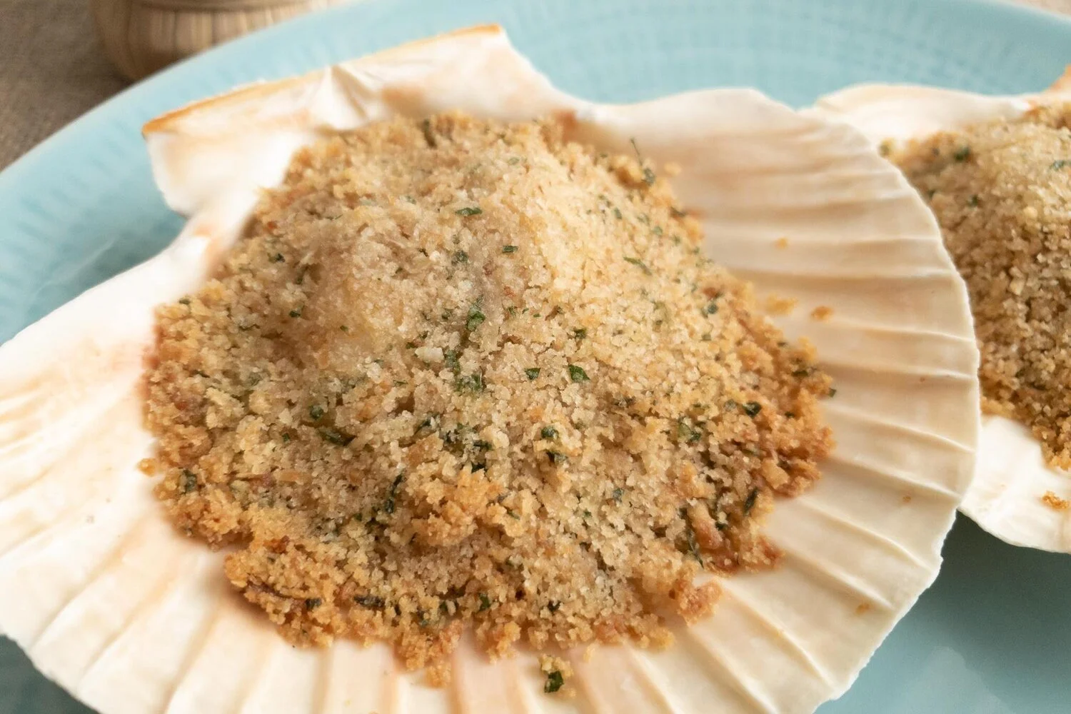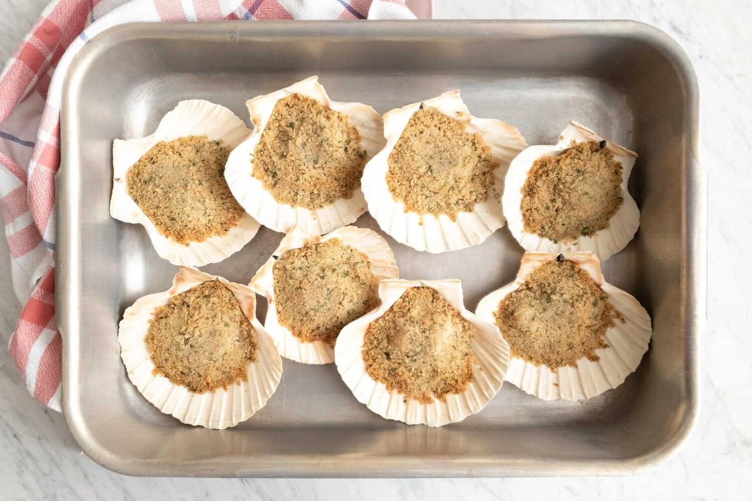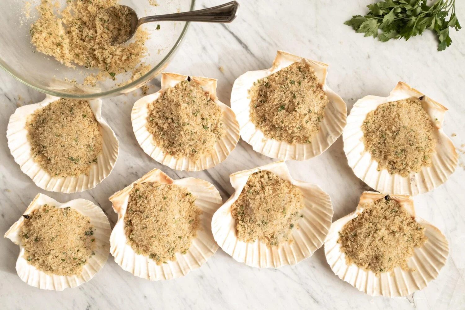 Spoon 1-2 Tbsp of the breadcrumb mixture over each scallop and press down the breadcrumb mixture slightly with the back of the spoon.
