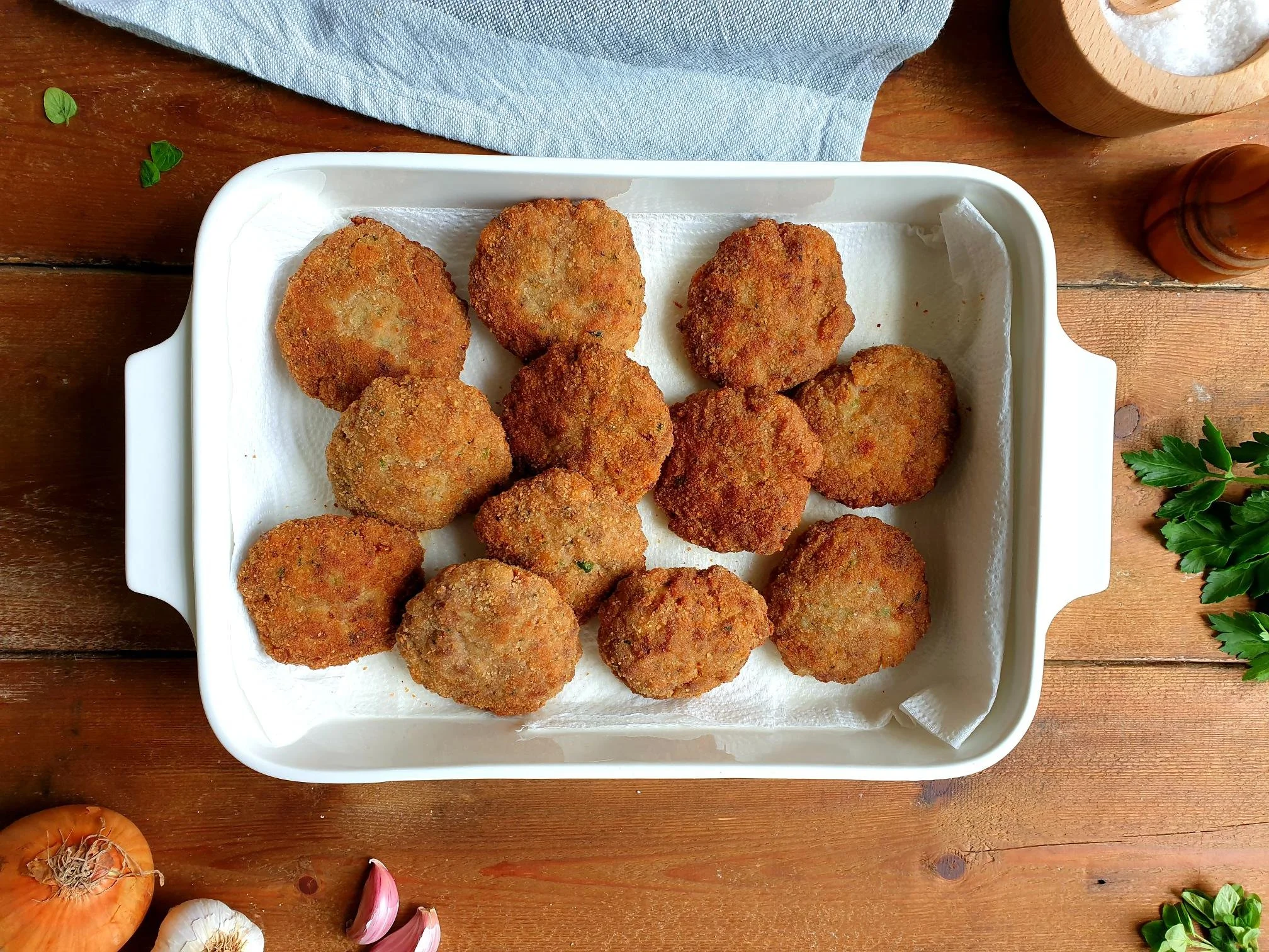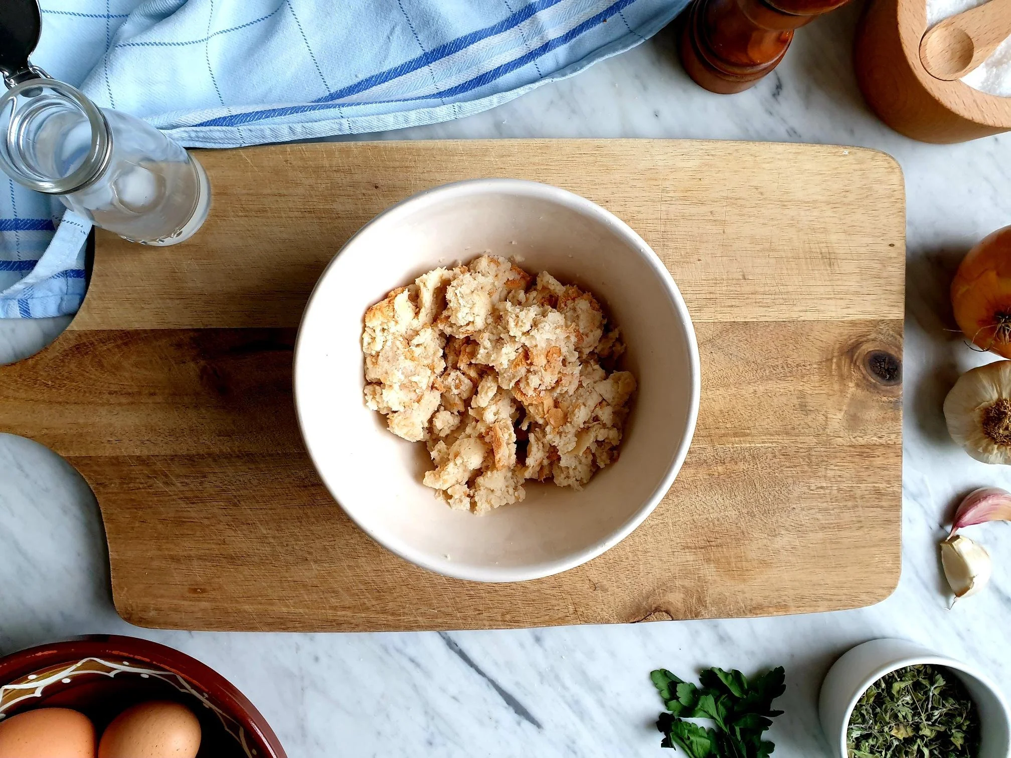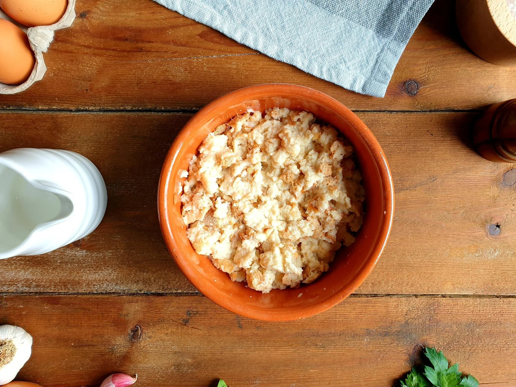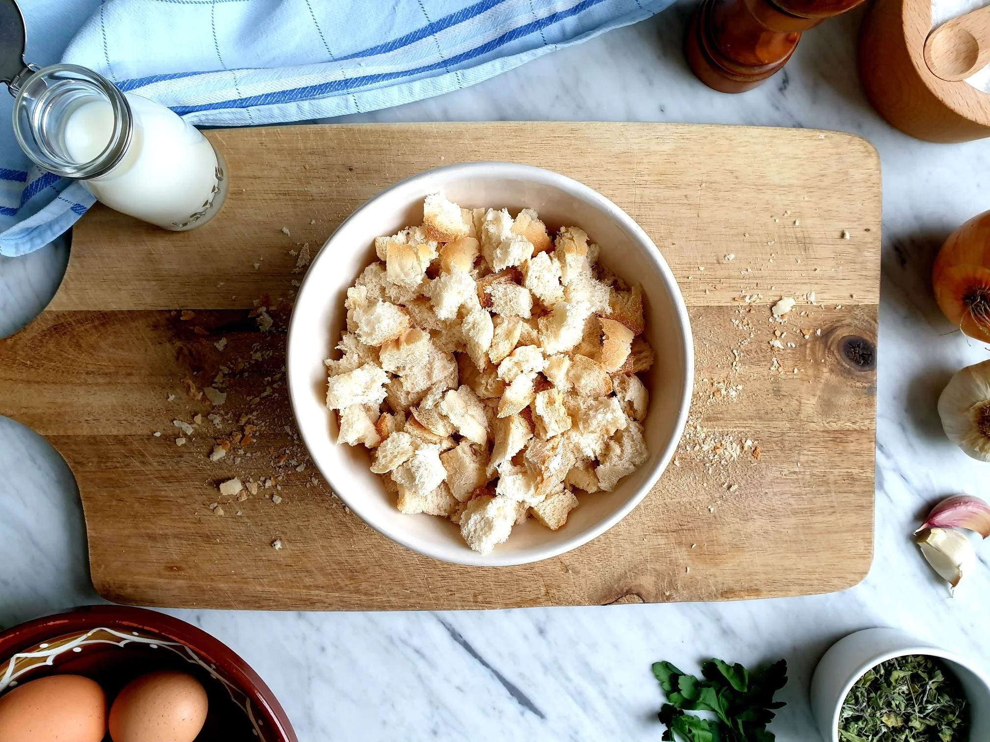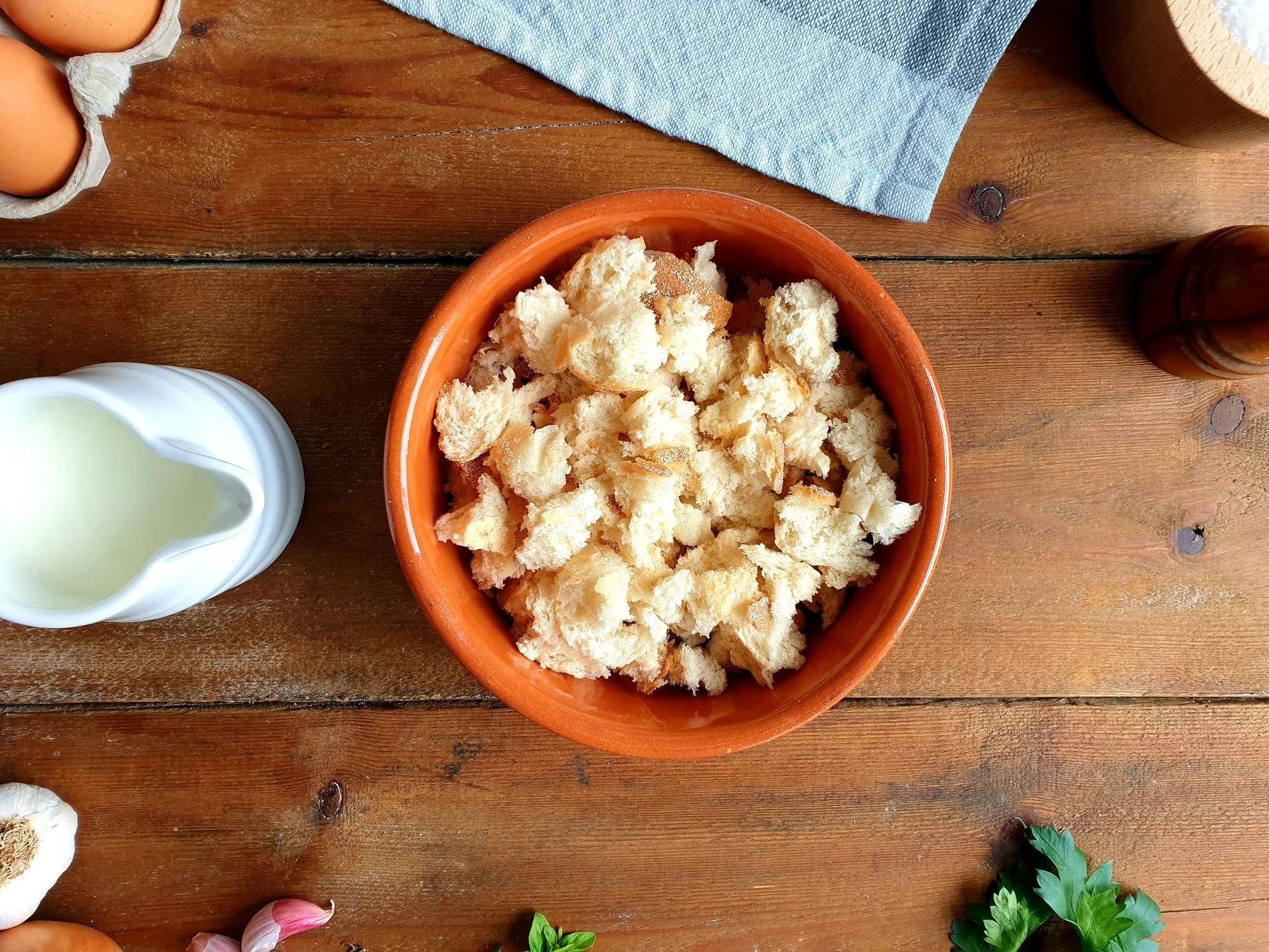 Cut or tear with your hands white baps (or any other type of stale bread you are using) into small pieces and put them into a bowl. Pour over the milk, mix well and leave to soak for a few minutes until the bread is completely softened (if necessary squeeze out gently with your hands excessive milk).