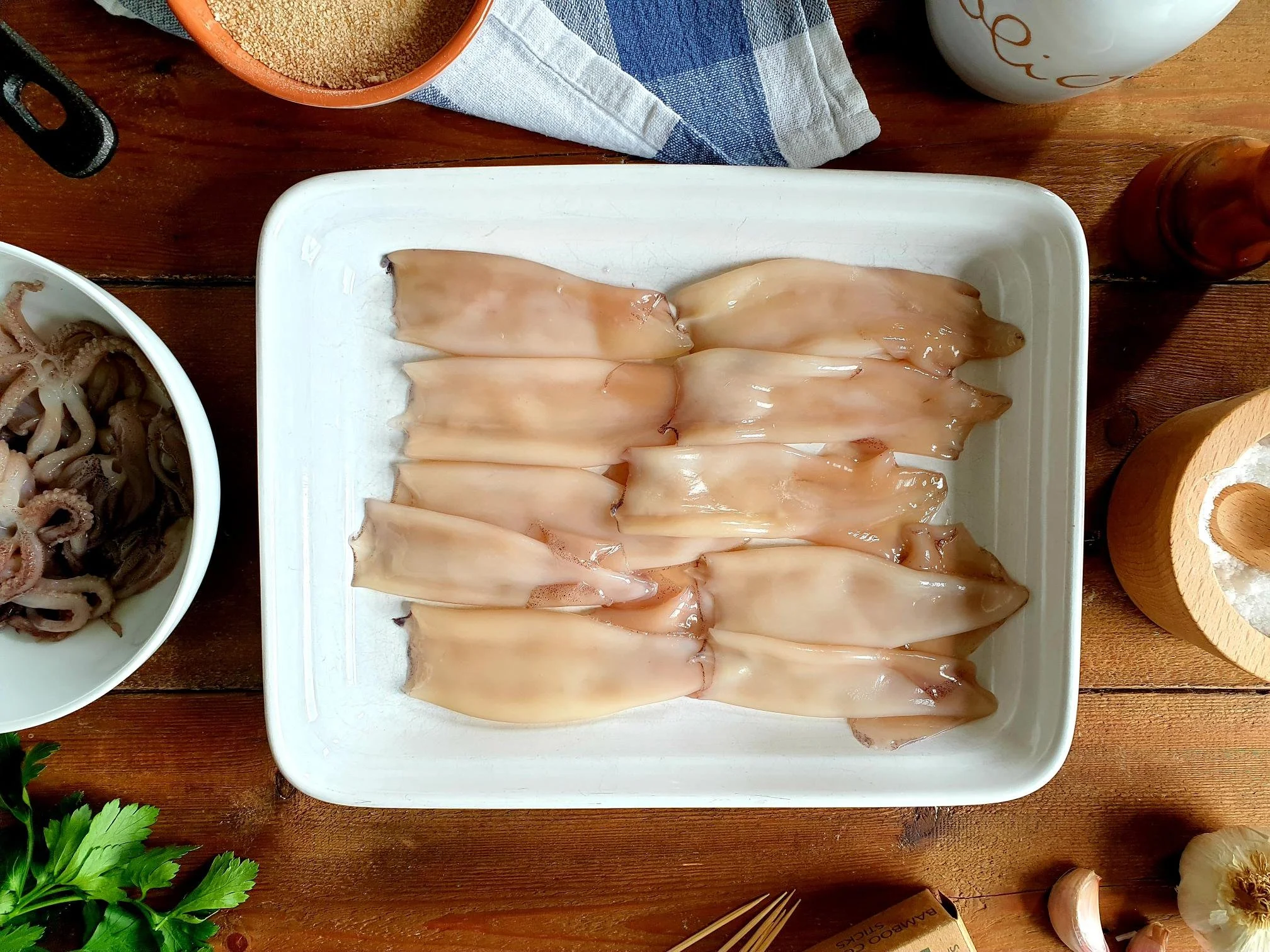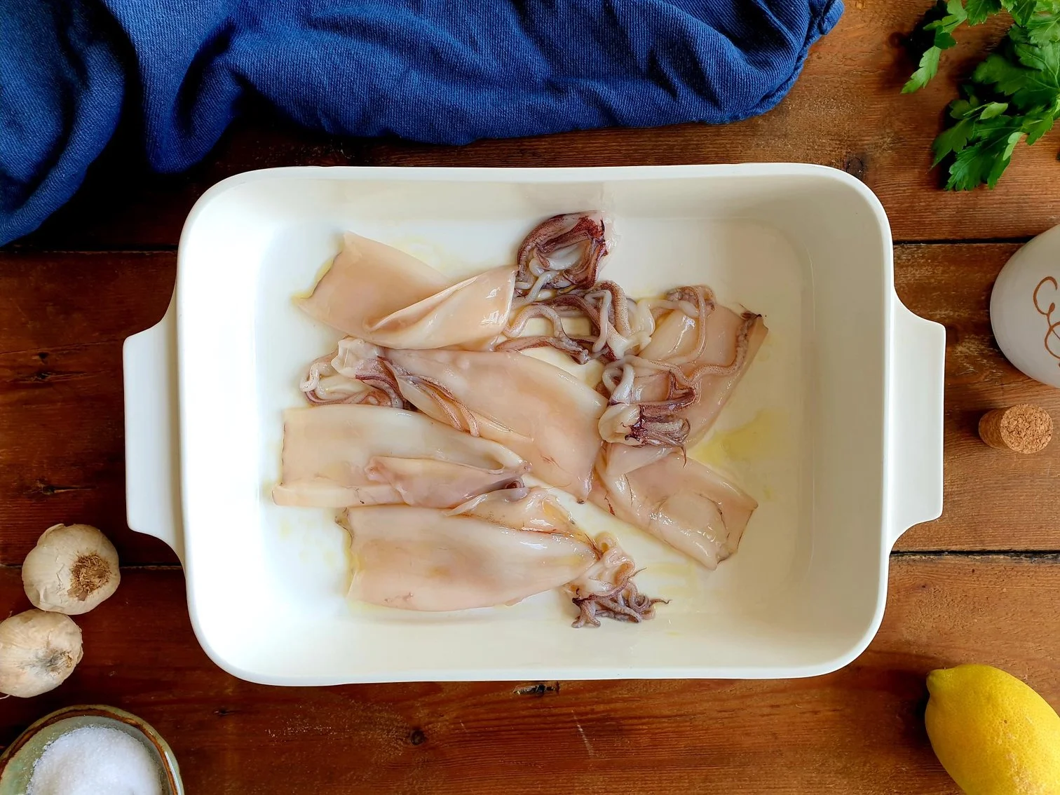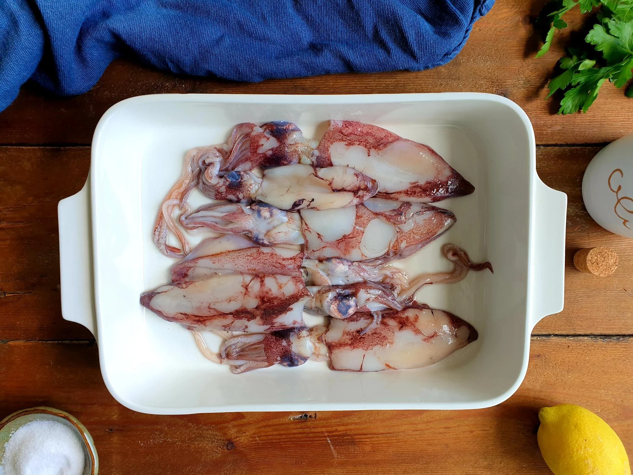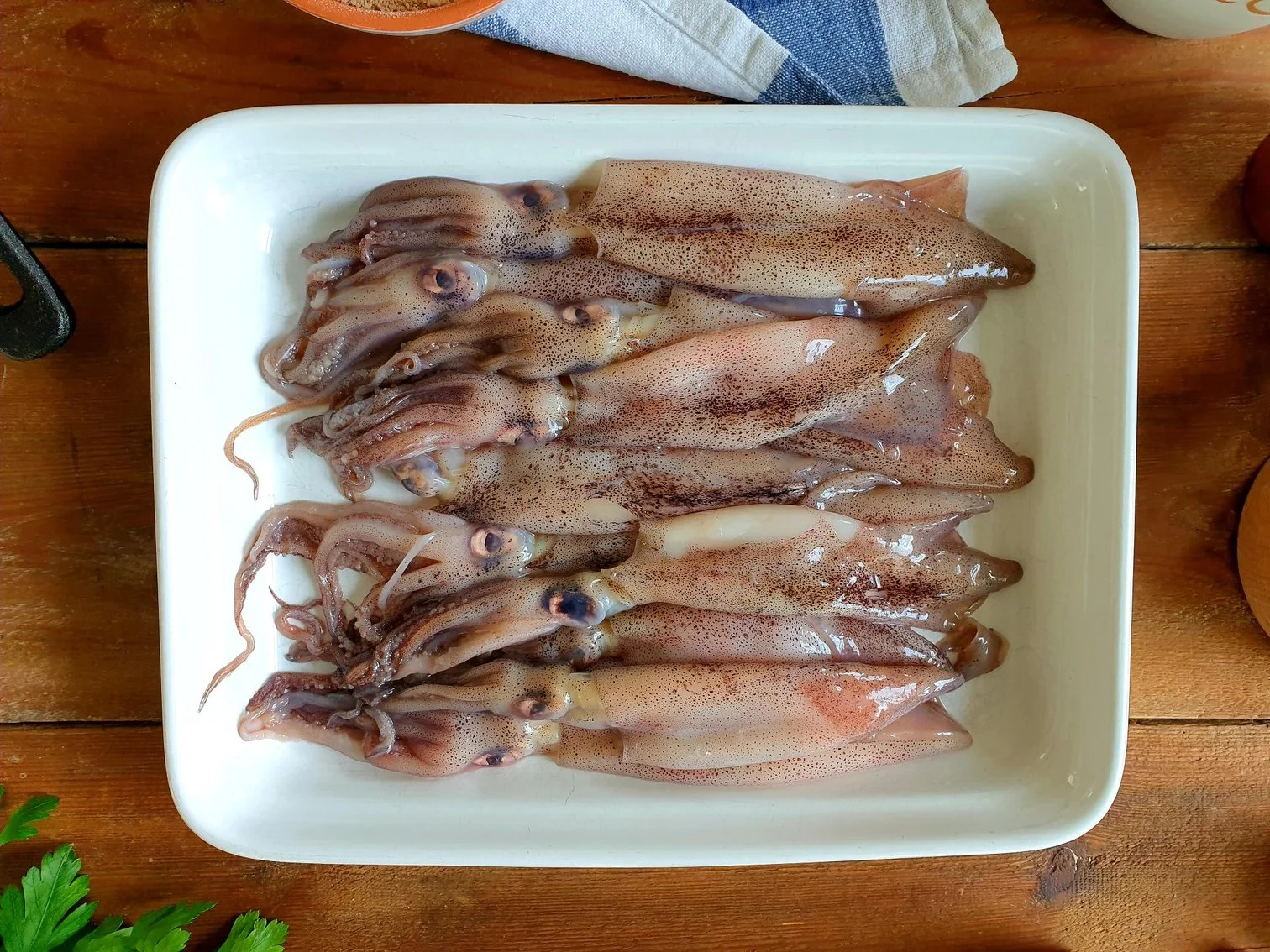 Clean and prepare the fresh squid and separate the tentacles. When cleaning the squid be careful not to damage the pockets (sacks), as the filling might come out during the cooking process.