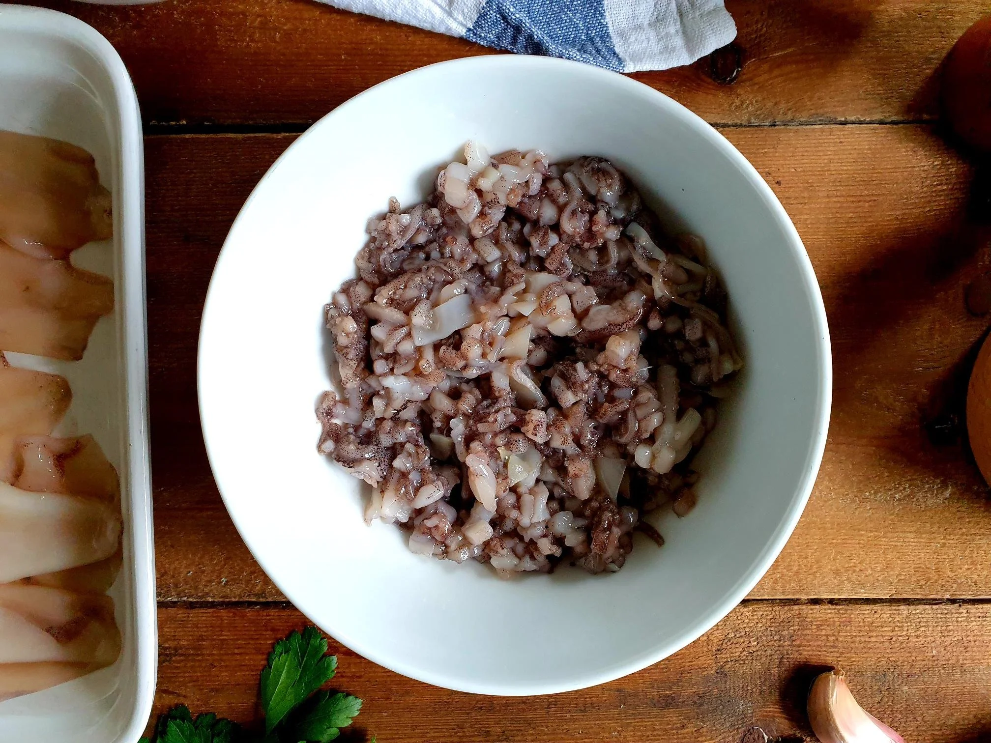 Sometimes when you buy frozen squid, they come with no tentacles. In this case you can replace the tentacles for the filling with 1-2 thin slices of finely chopped Prosciuutto crudo (Italian dry ham). Be mindful of the seasoning as the prosciutto crudo is quite salty.