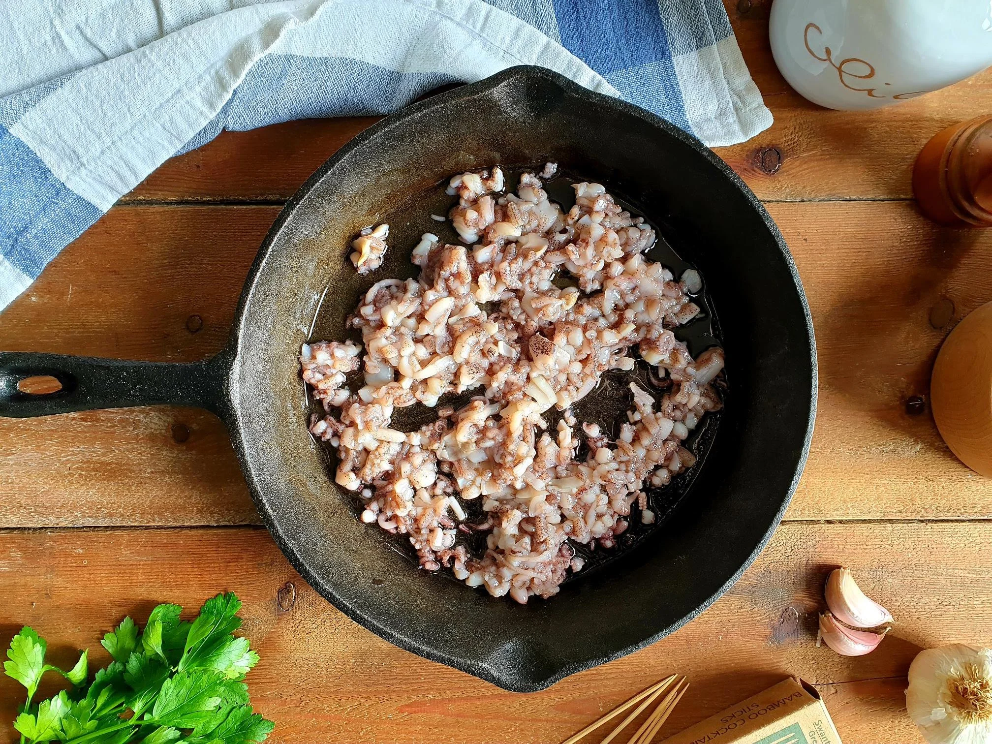 (the sacks of the squid should be long between 13-15cm, if they are too short and small you will find it a bit tricky to fill, very big squid not particularly suitable for this recipe), bodies and tentacles separated, if using frozen squid, defrost first