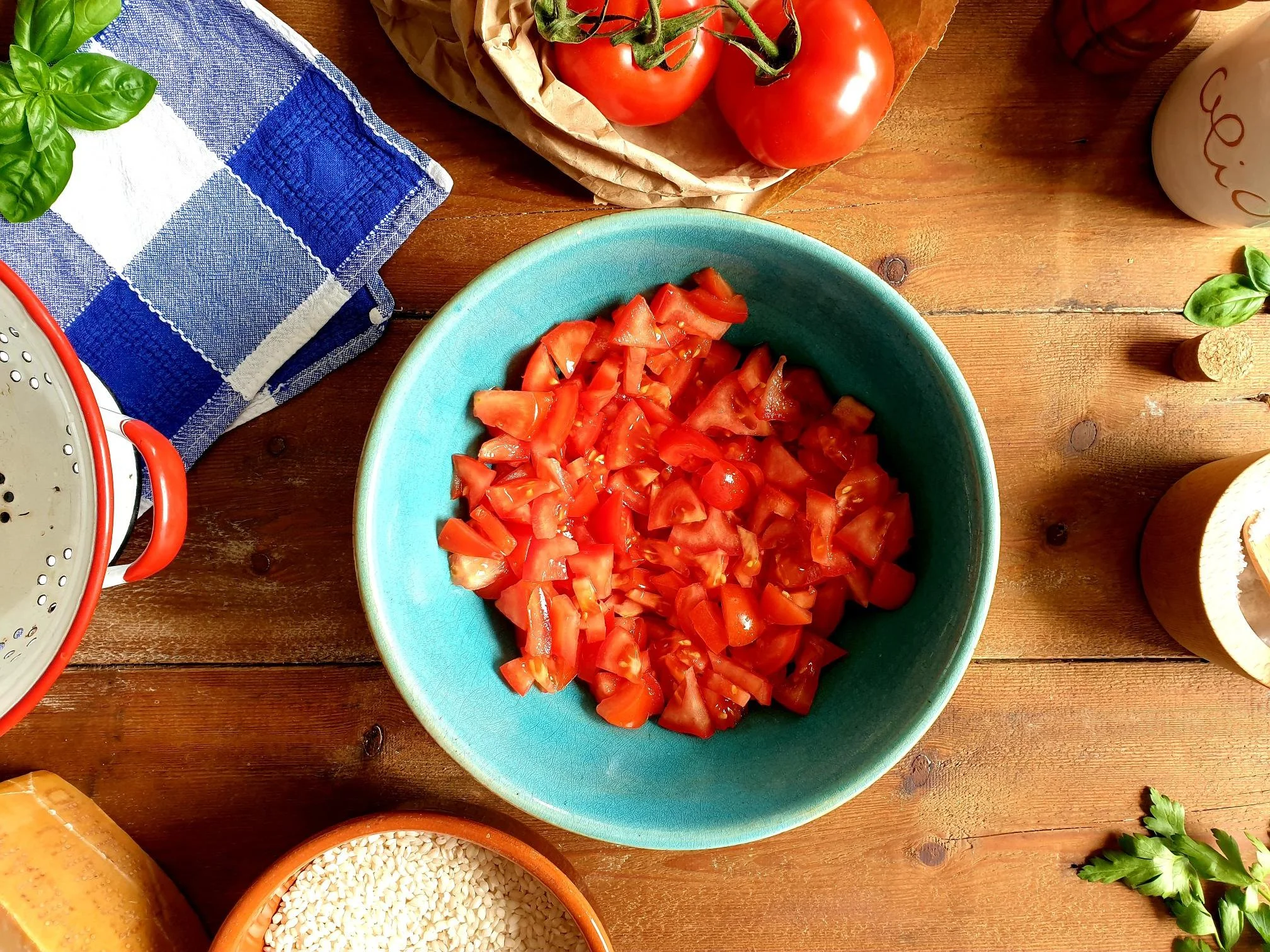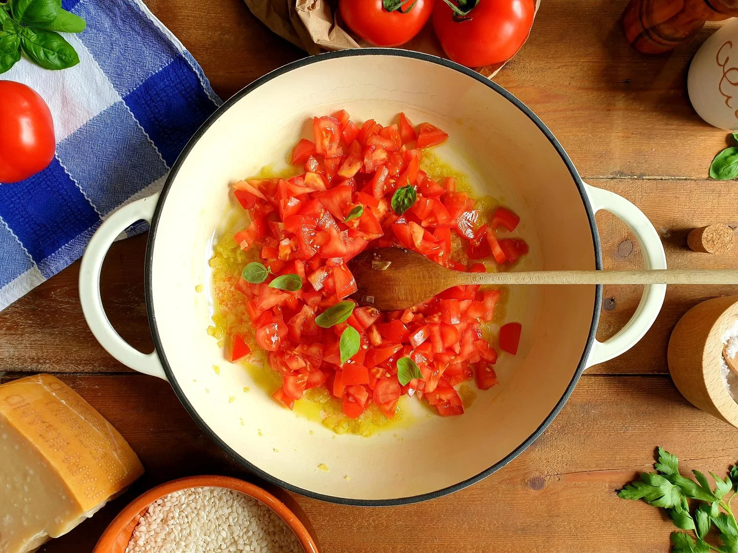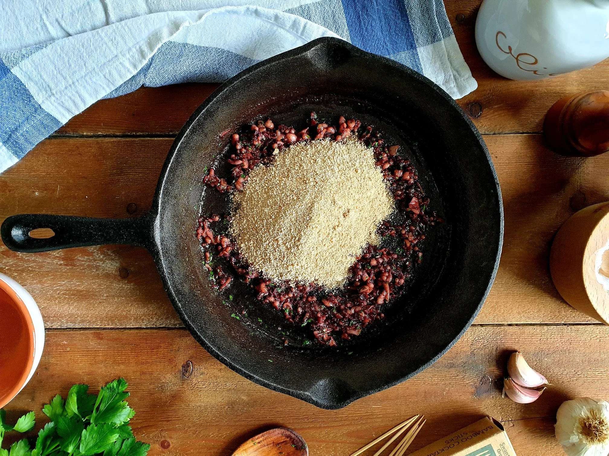 Add chopped tomatoes, dry breadcrumbs, finely chopped parsley, 400ml of water and a pinch of sea salt.