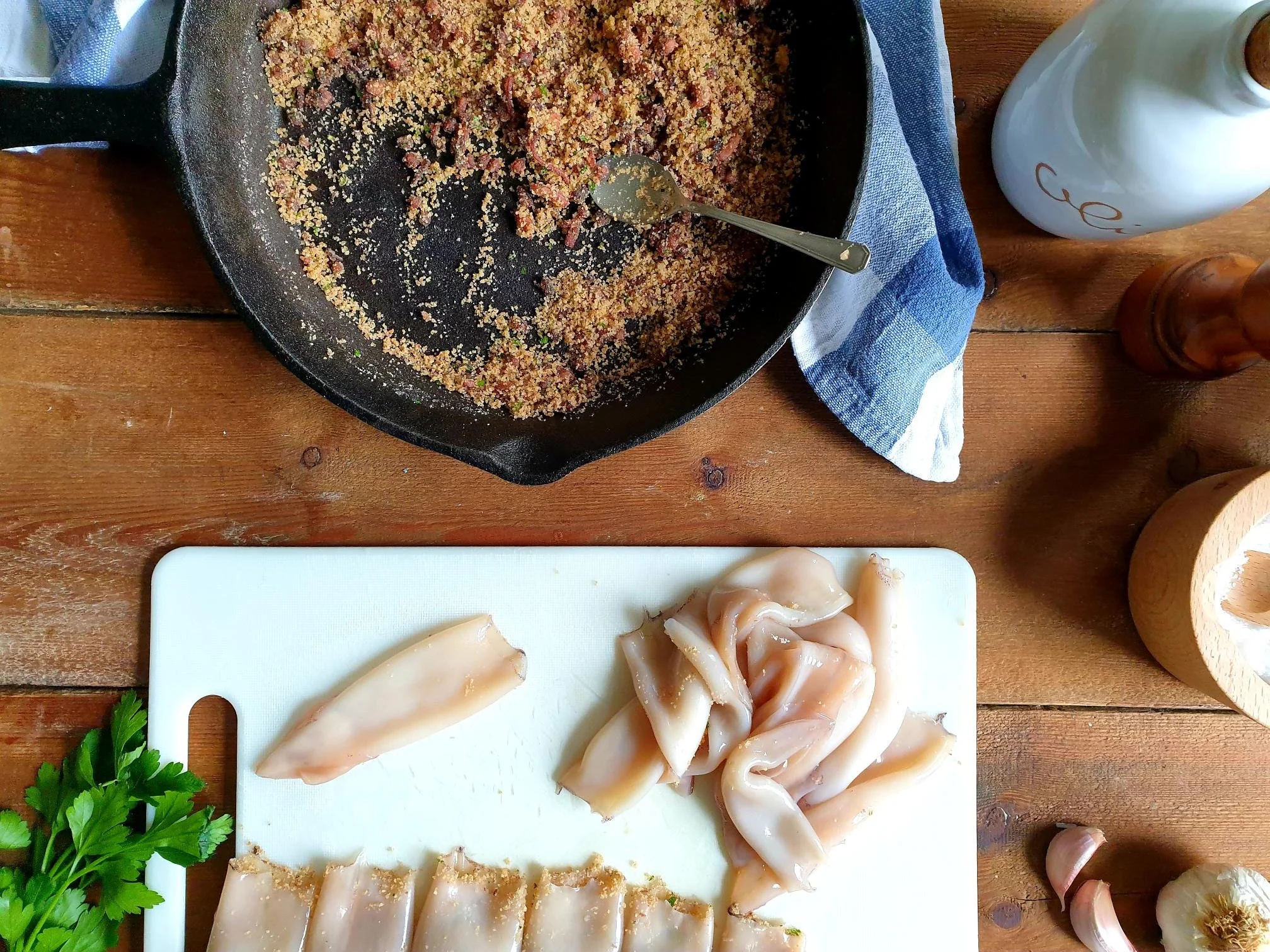 Stuffed squid represents one of the most quintessentially Istrian seafood based dishes, it is made in the households, maybe not perhaps as your average mid week supper but prepared during the weekends or festivities or to mark a special occasion. Along the Slovenian coast stuffed squid would be traditionally briefly cooked in white busara sauce (simple sauce made with olive oil, hint of garlic, white wine and fresh parsley), as supposed to the red busara sauce variation where tomato element is added to the basic white busara sauce.