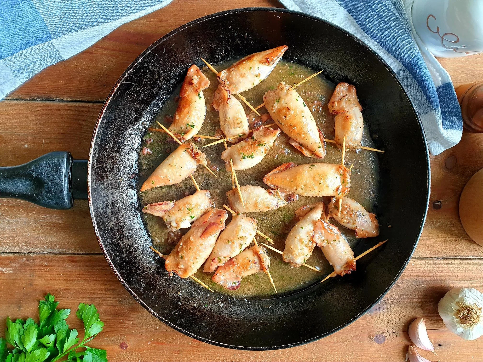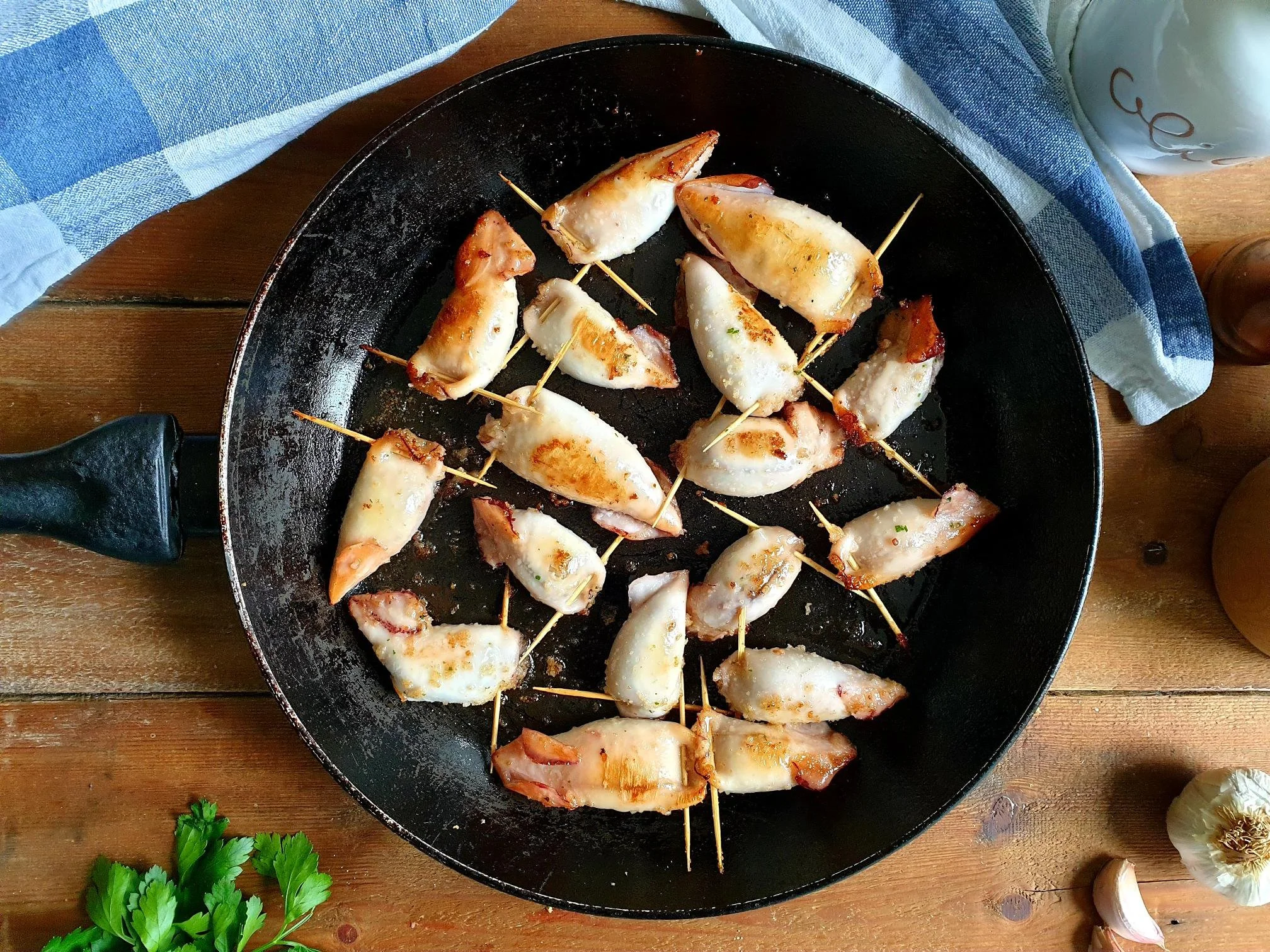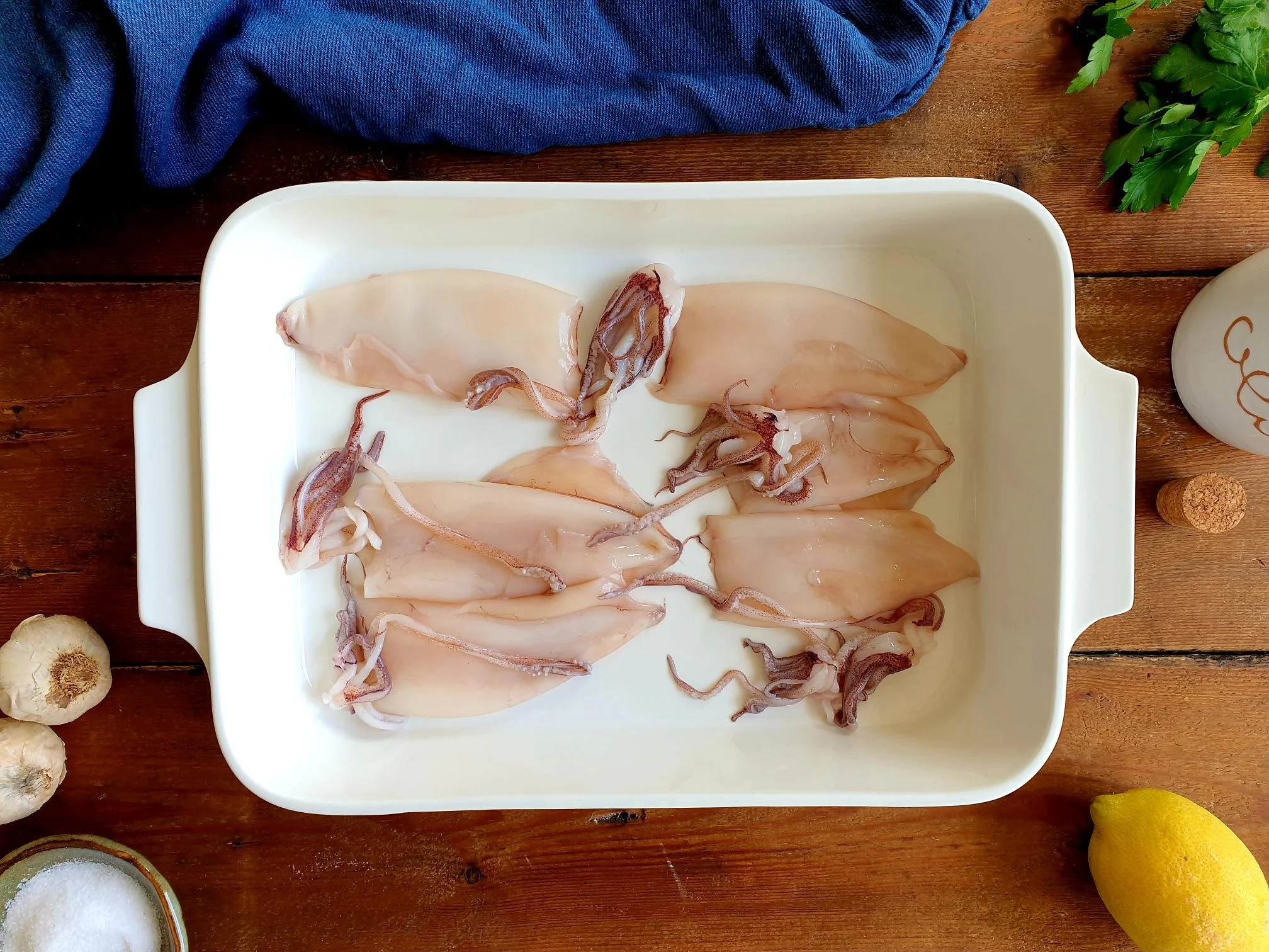 stuffed squid, stuffed calamari, polnjeni kalamari, nadevani lignji, calamari ripien), fresh squid, frozen squid, white busara sauce, white buzara souce