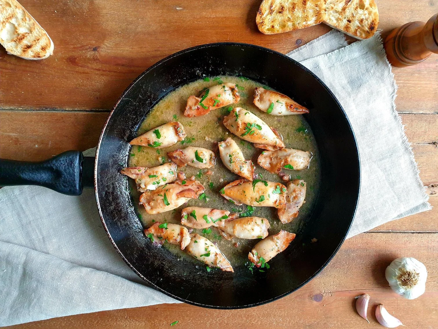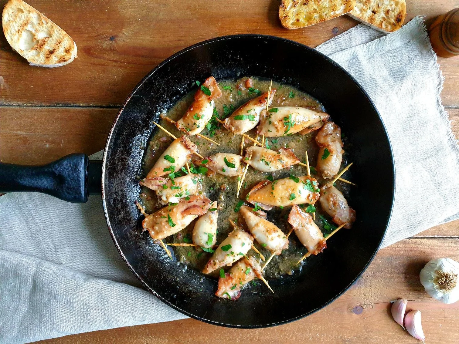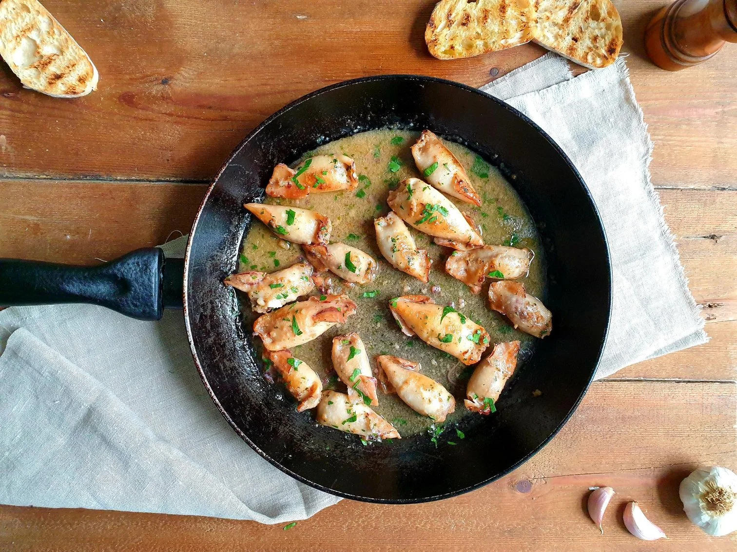 stuffed squid, stuffed calamari, polnjeni kalamari, nadevani lignji, calamari ripien), fresh squid, frozen squid, white busara sauce, white buzara souce