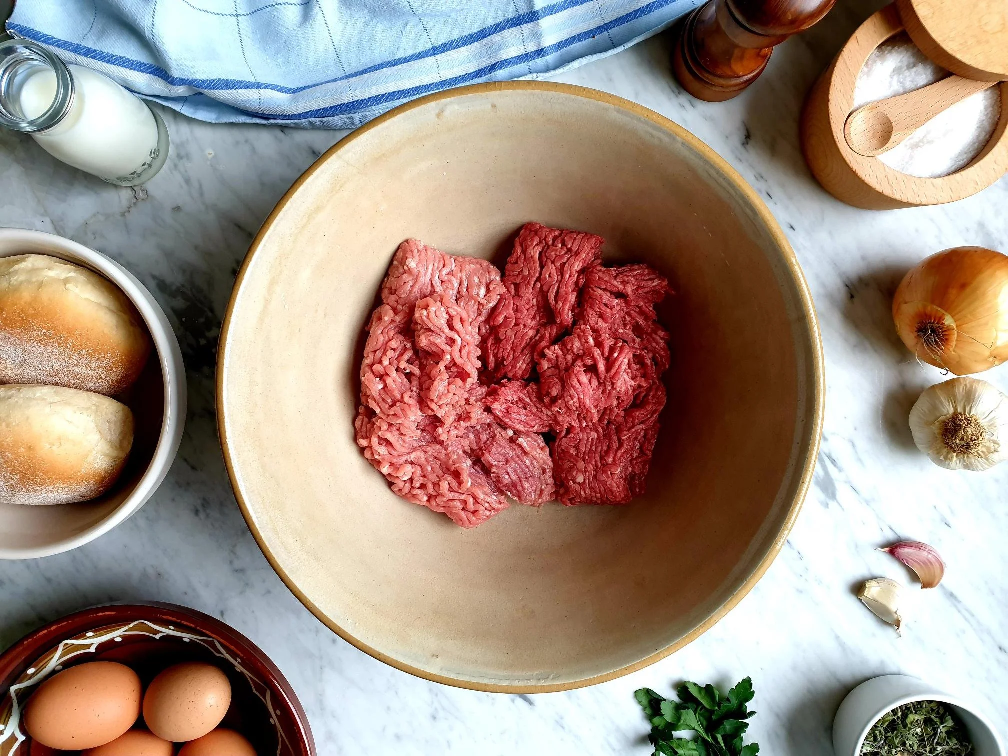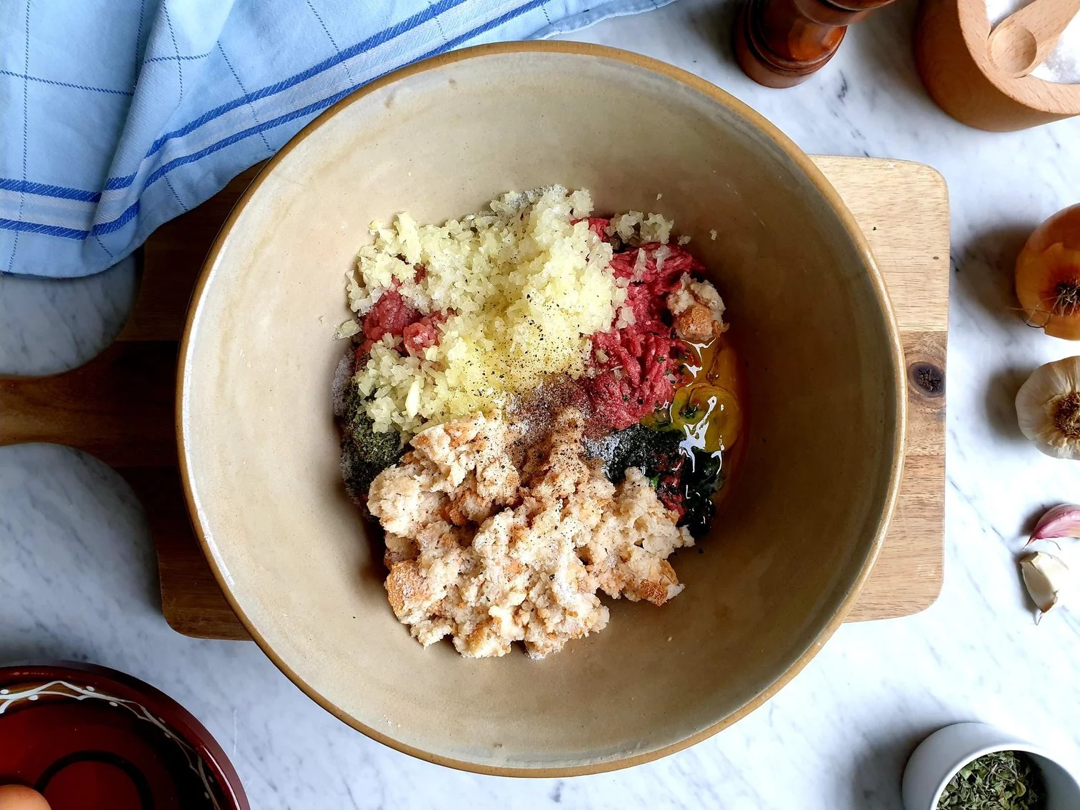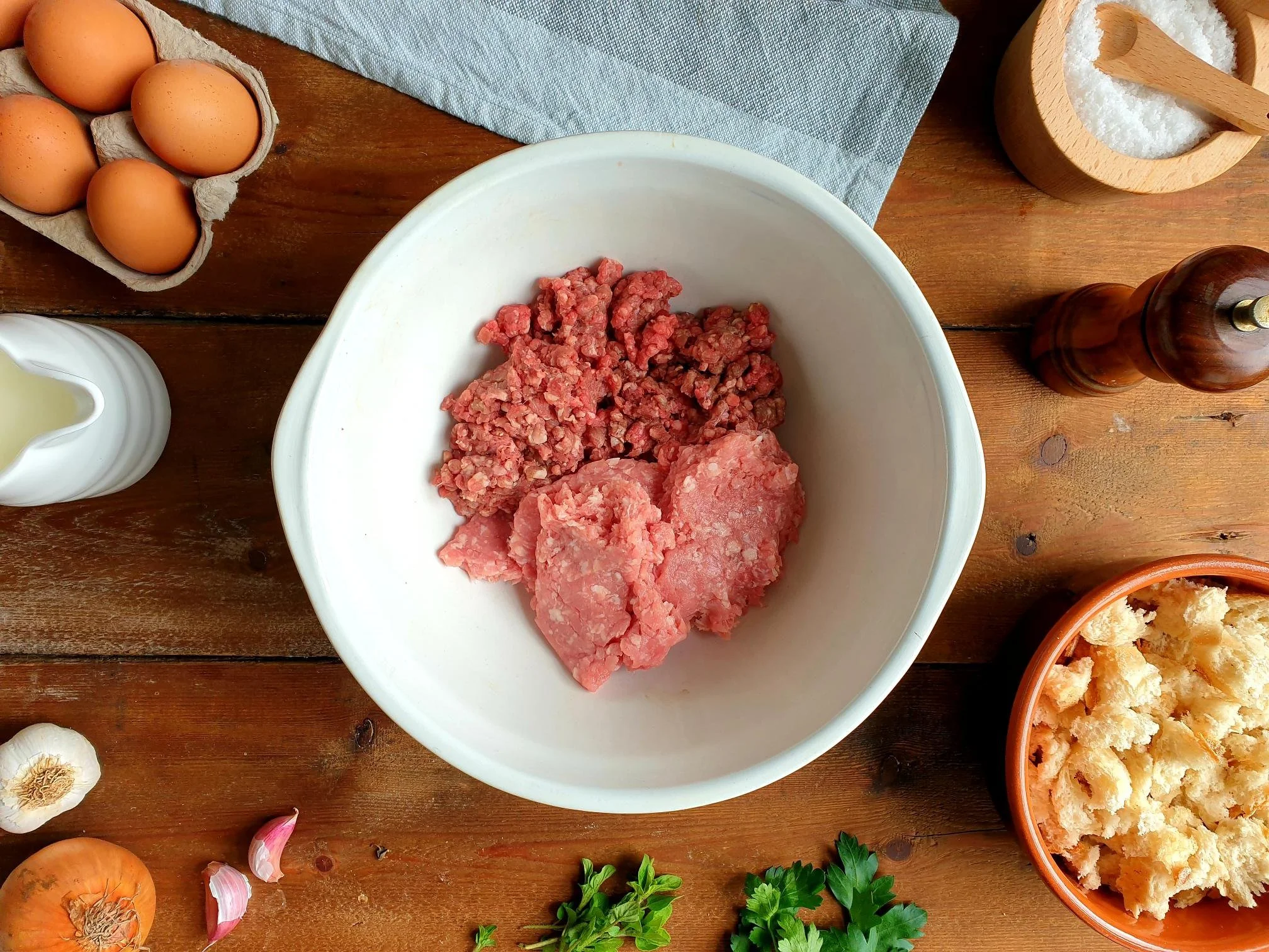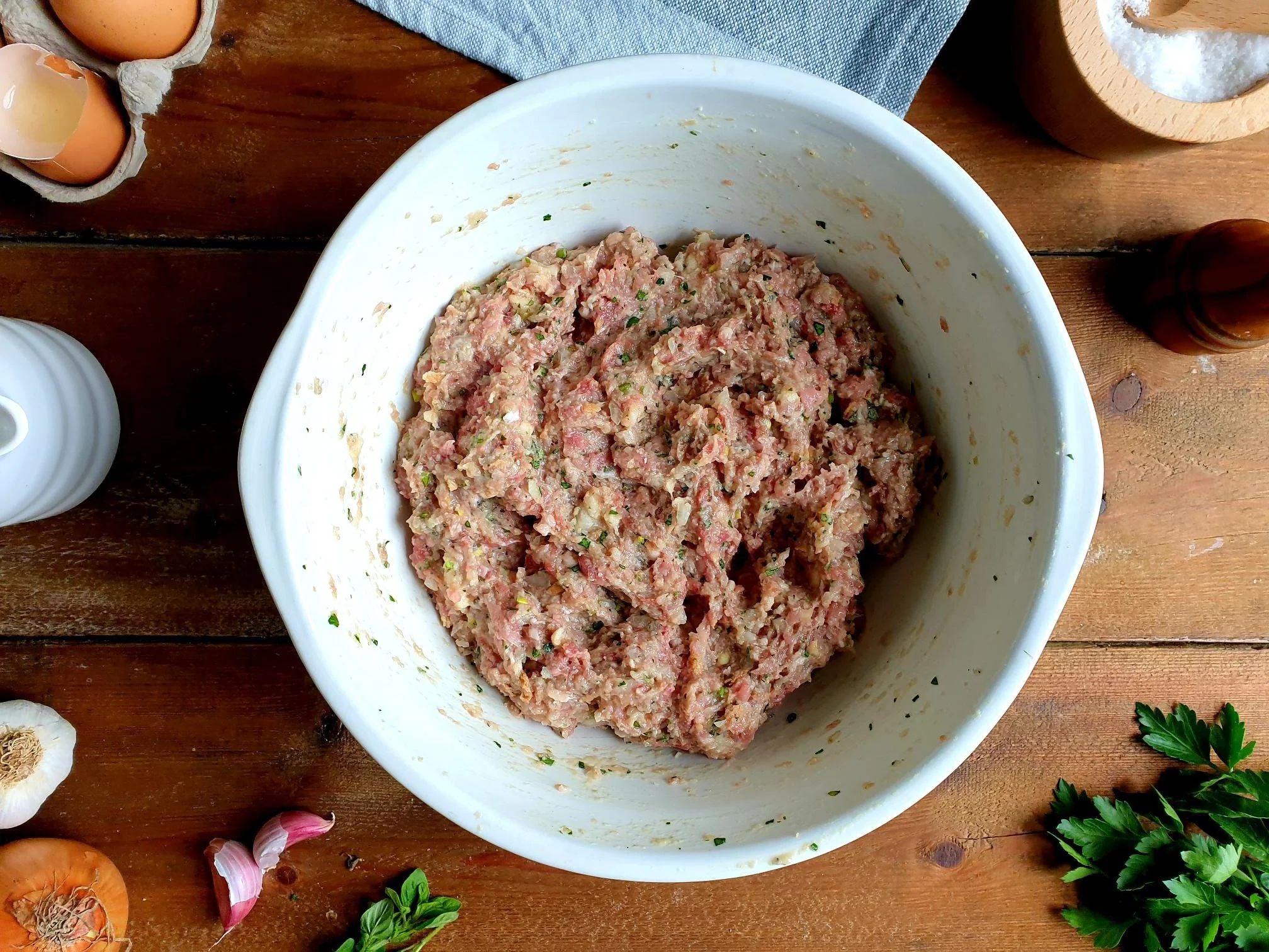 Put both minced beef and minced pork in a fairly large bowl. Add finely chopped onions, crashed garlic, finely chopped fresh parsley and marjoram, lightly beaten egg, generous pinch of sea salt, black pepper and softened pieces of bread.