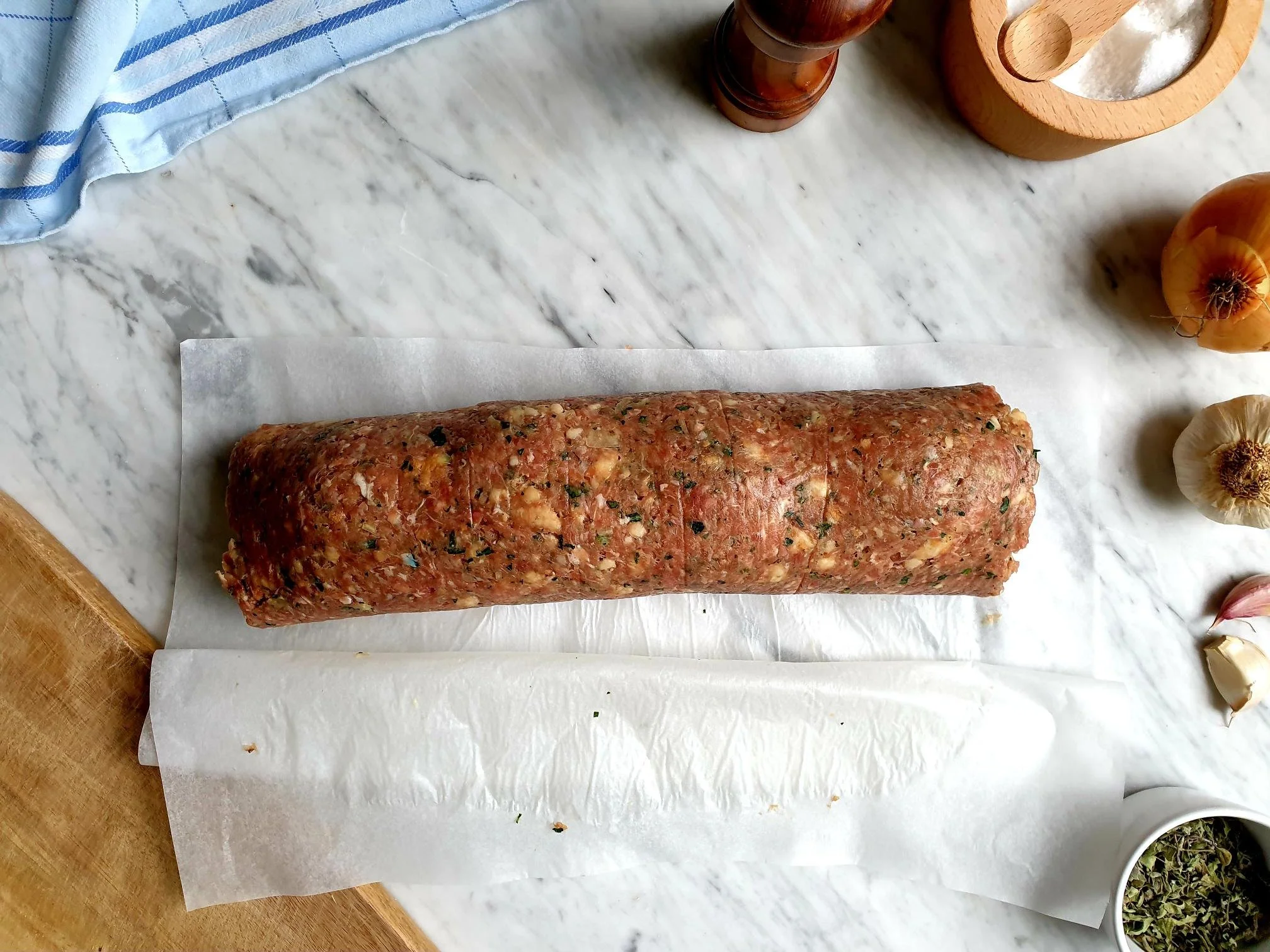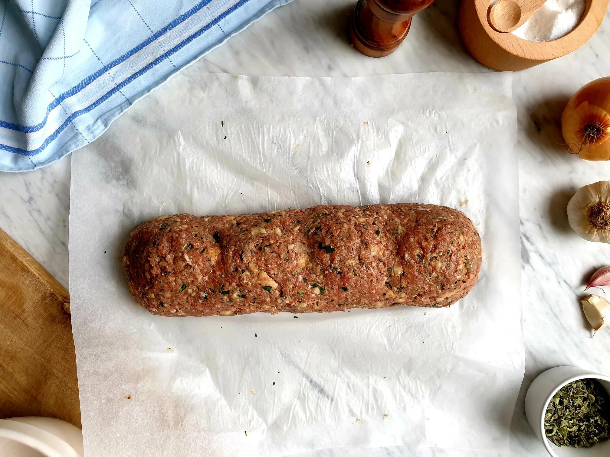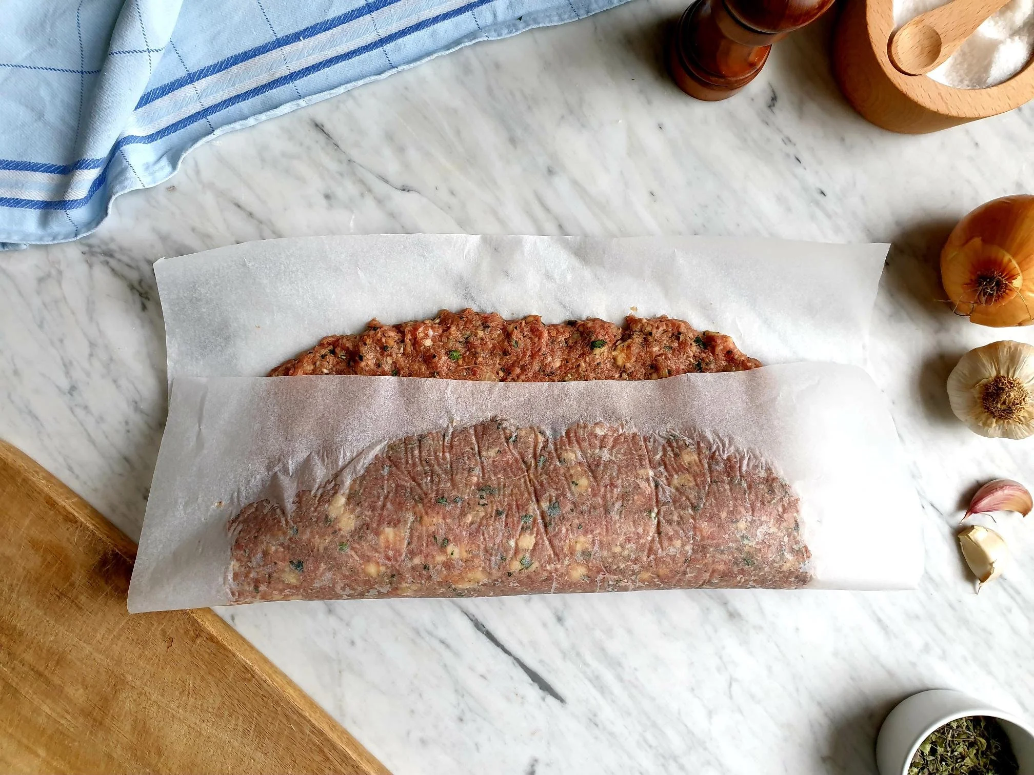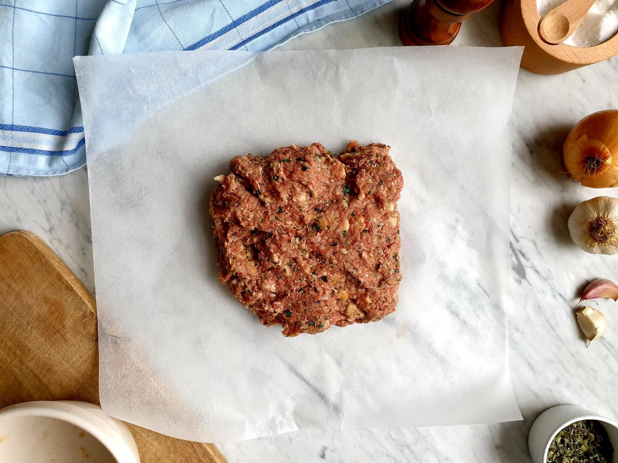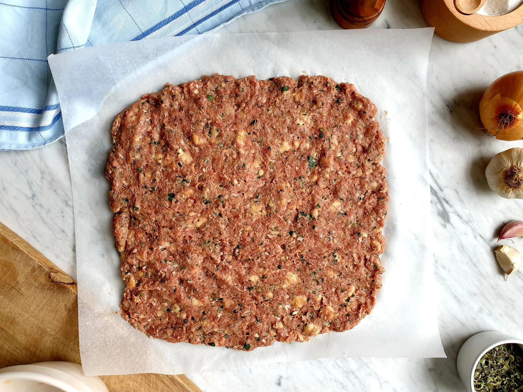 Transfer the meat mixture onto a large sheet of baking parchment (roughly the size of your baking tray) and flatten it with your hands into an approximate 30x25cm (12 x 10 inch) rectangle.
