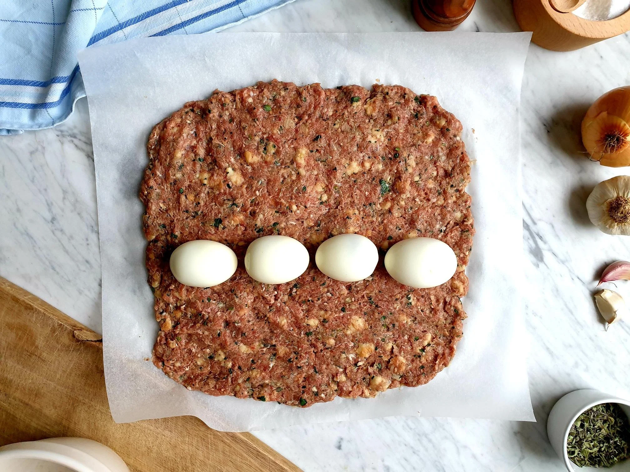 Place 4 whole hard boiled eggs in a row, along the centre and form the meatloaf around the eggs using the baking parchment.
