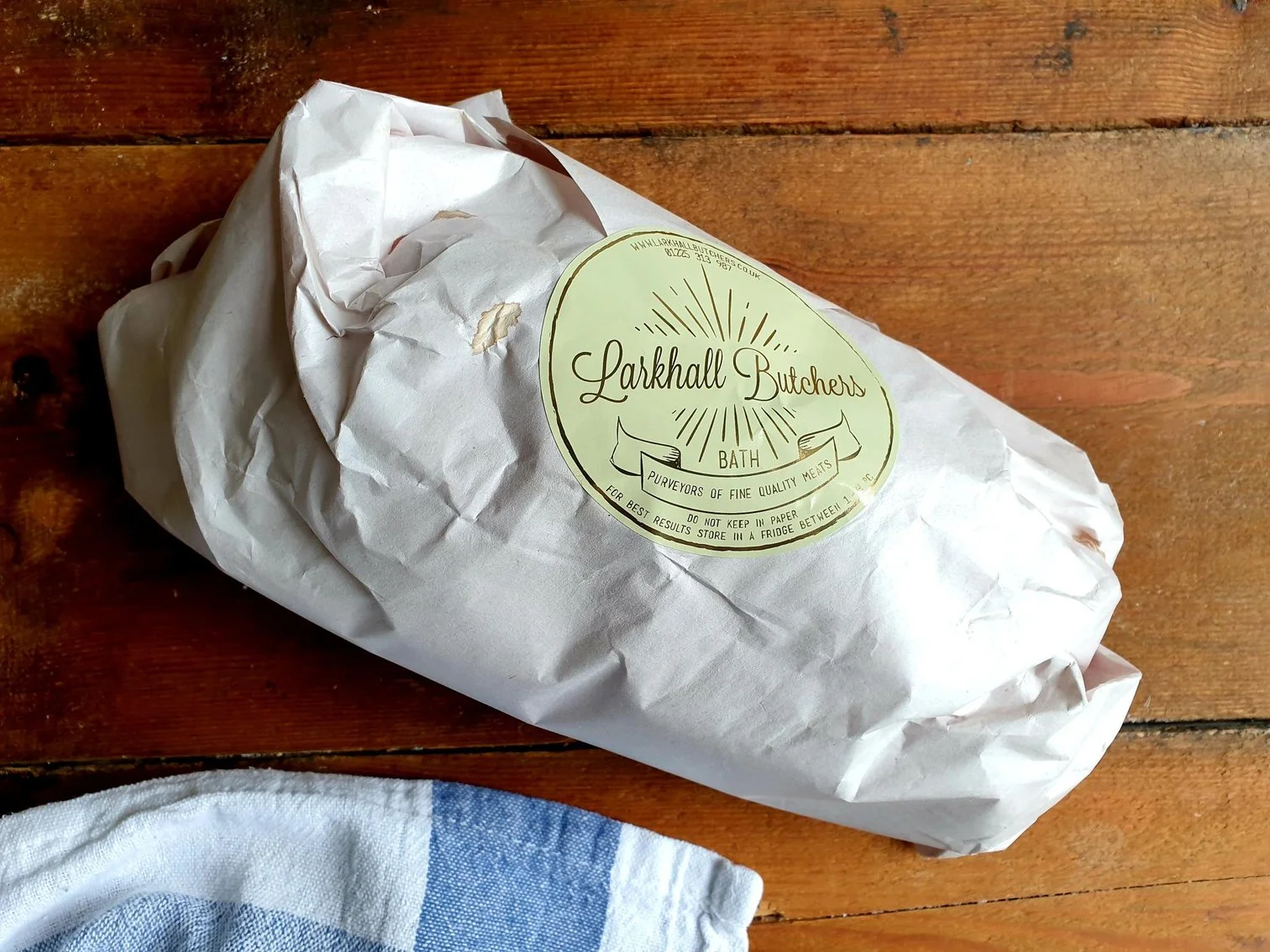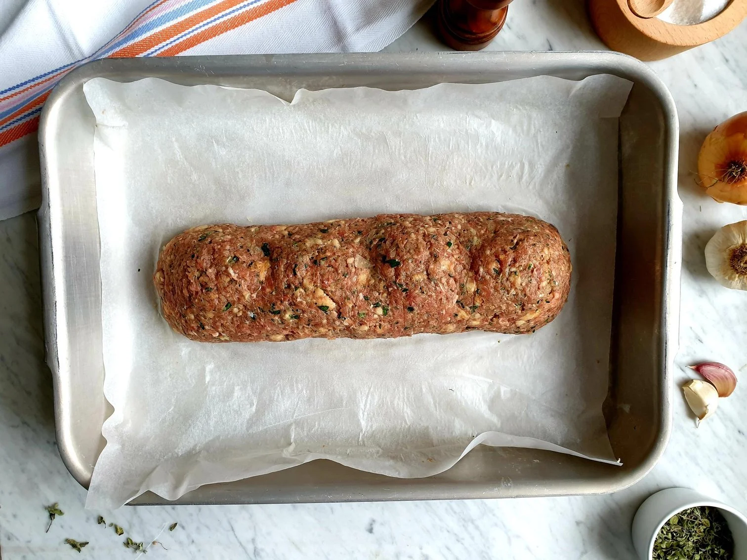 Transfer the meat loaf, seam side down (together with the baking parchment) on to a baking tray.