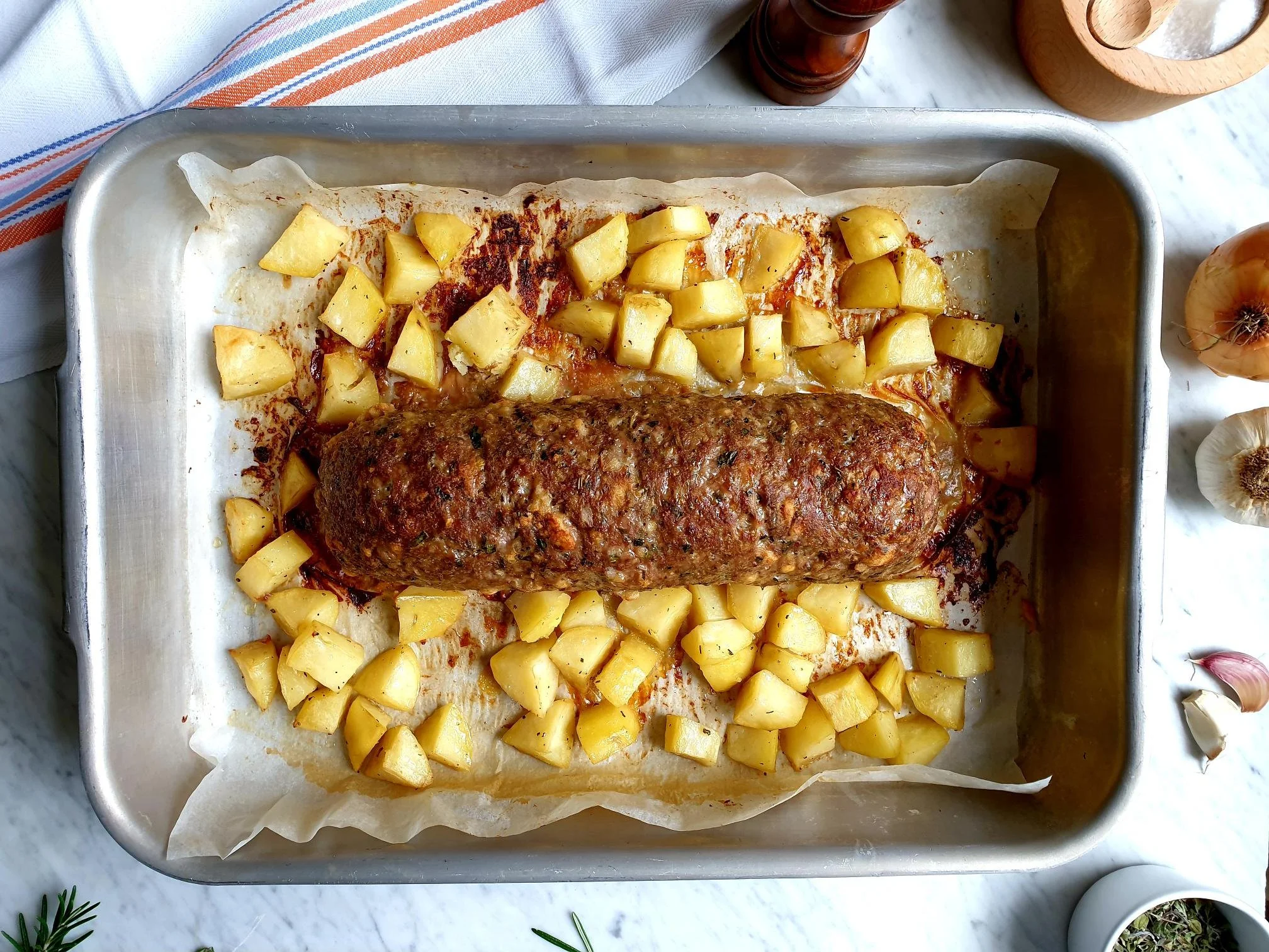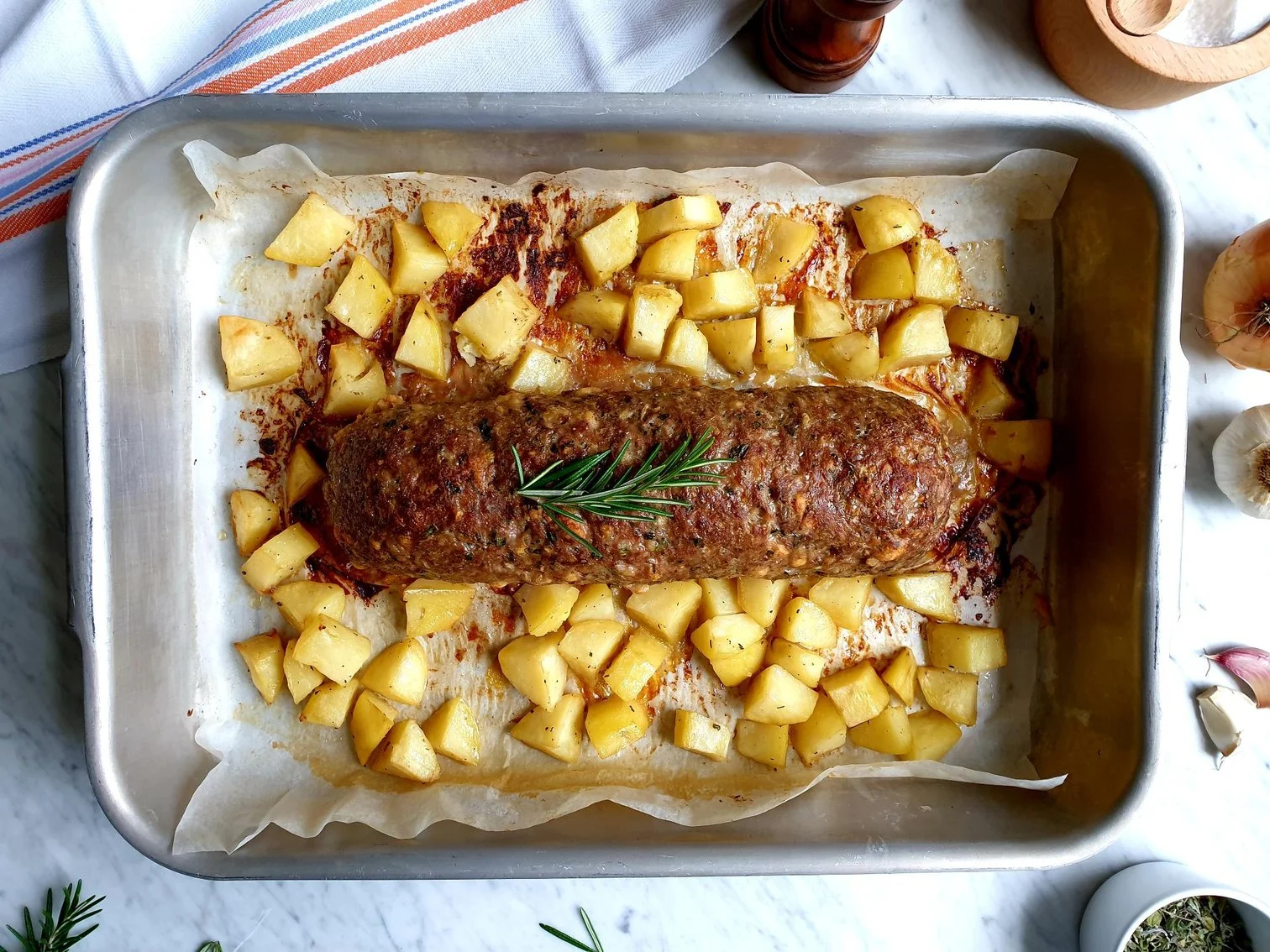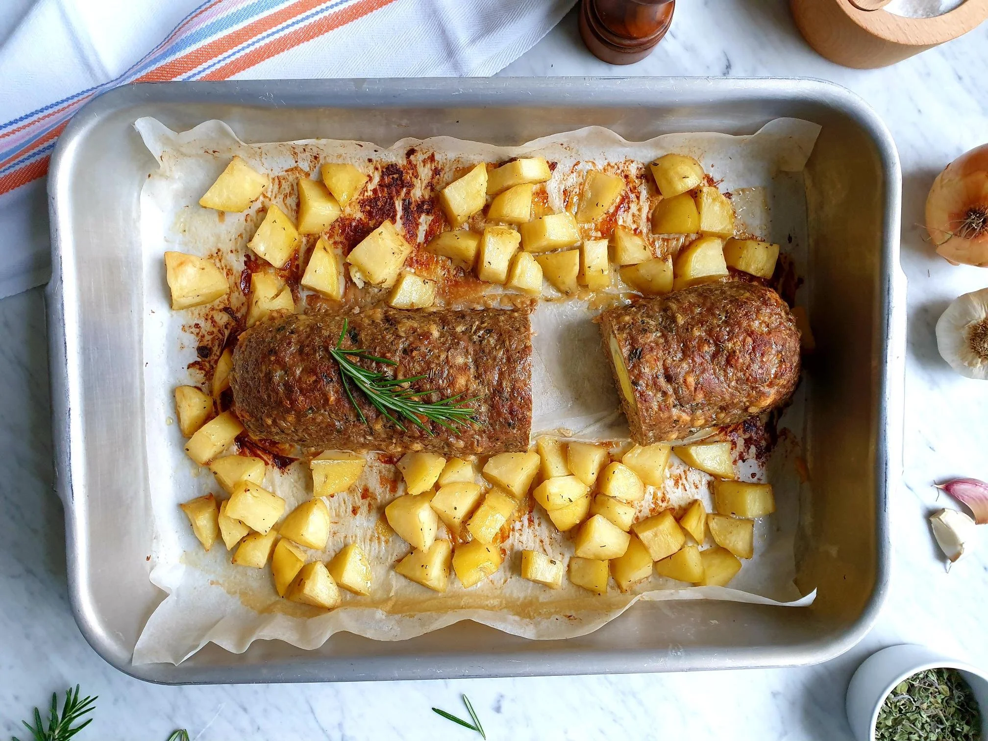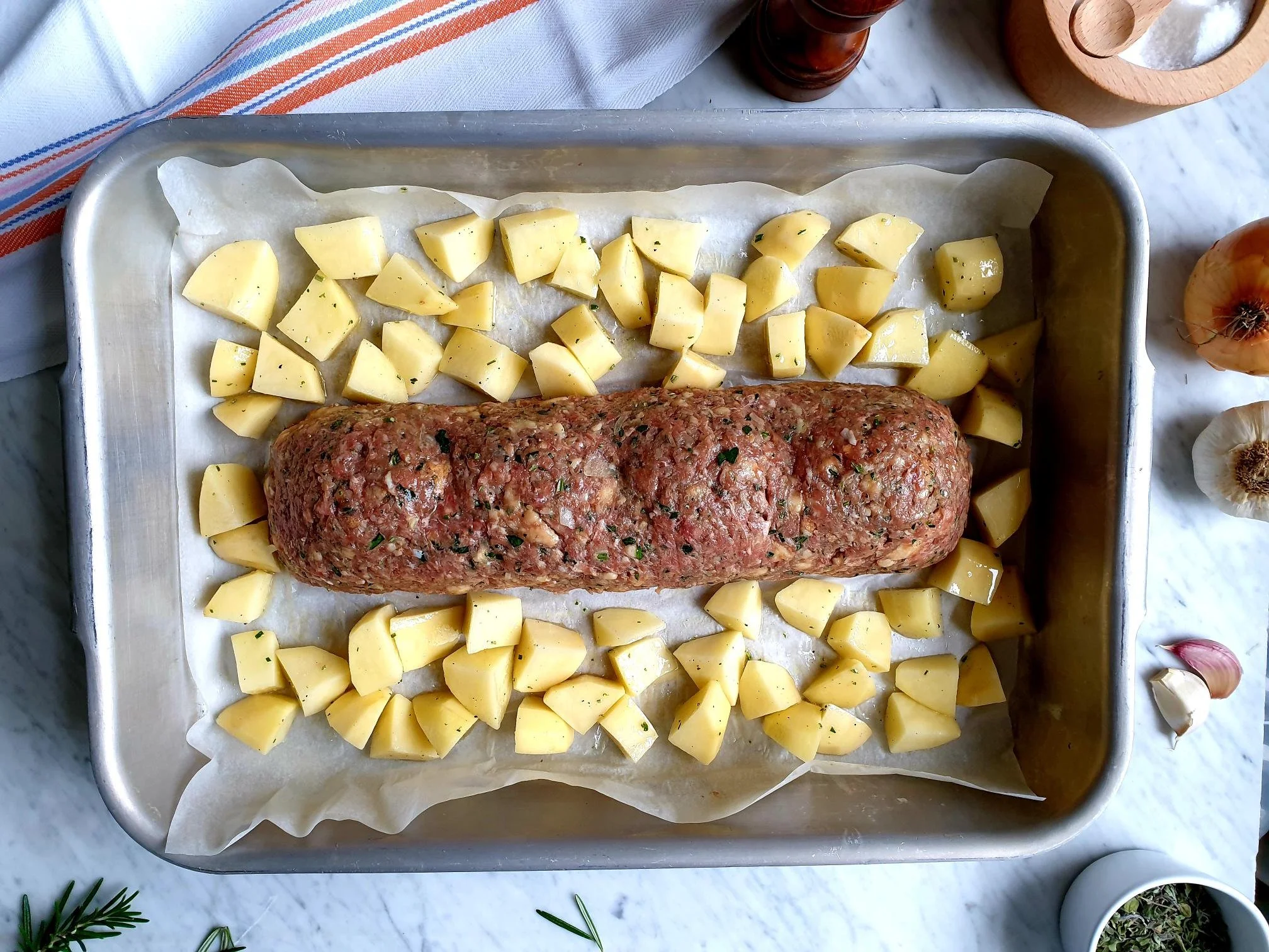 Place cubed potatoes around the meatloaf, drizzle with extra virgin olive oil and season with sea salt and black pepper to taste. With your hands arrange them in a single layer and mix and toss so all the cubed potatoes are evenly coated in olive oil and the seasoning.