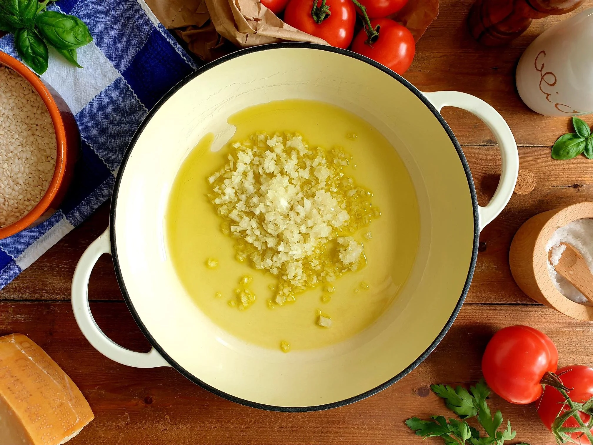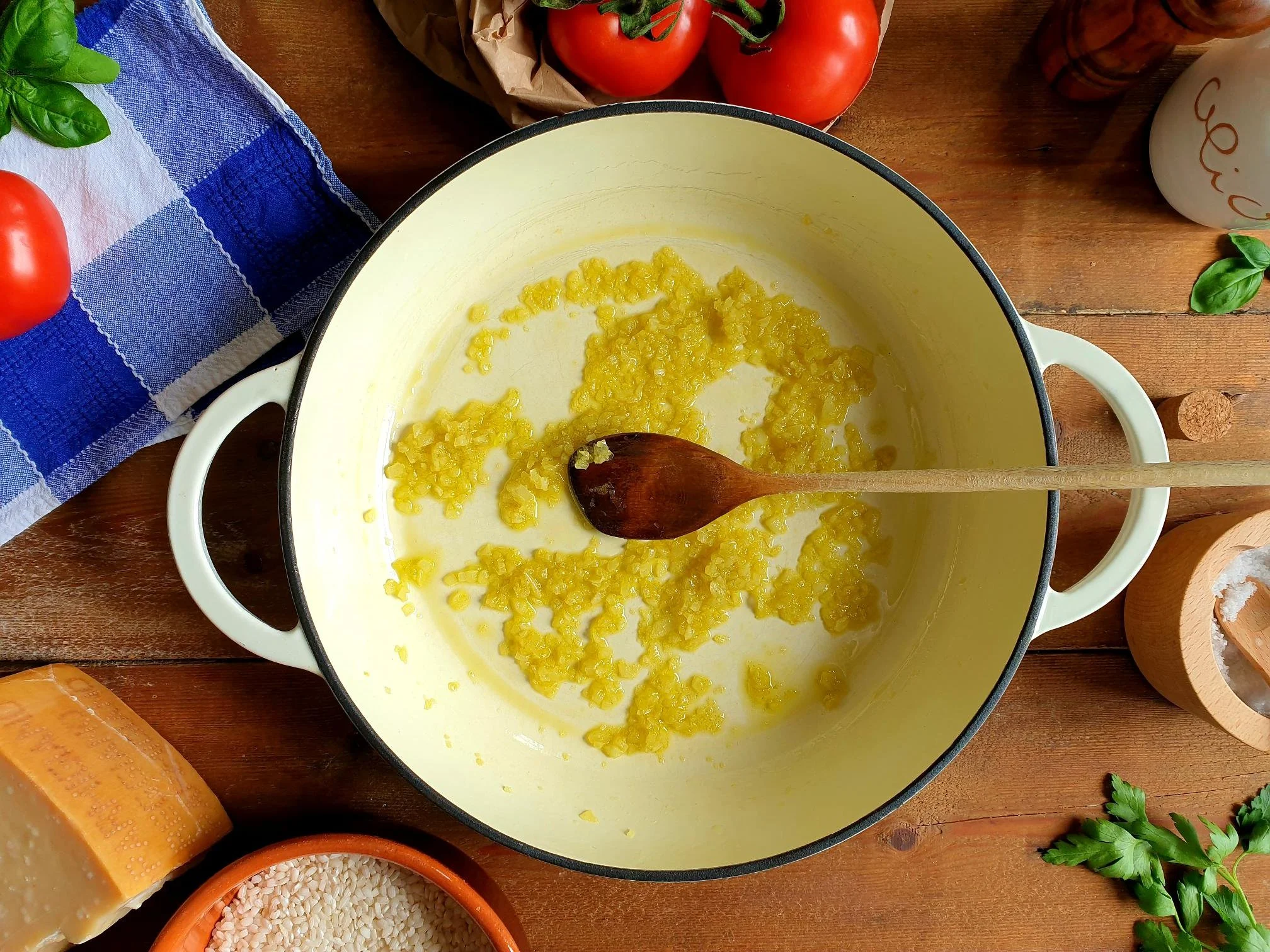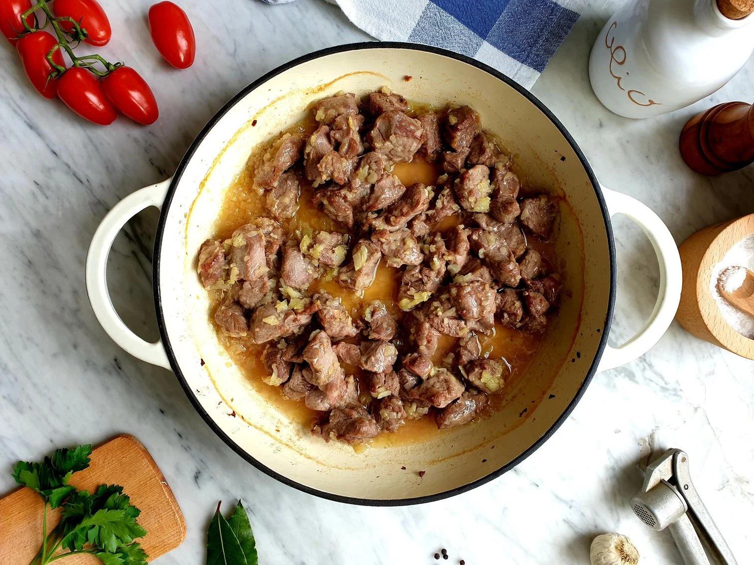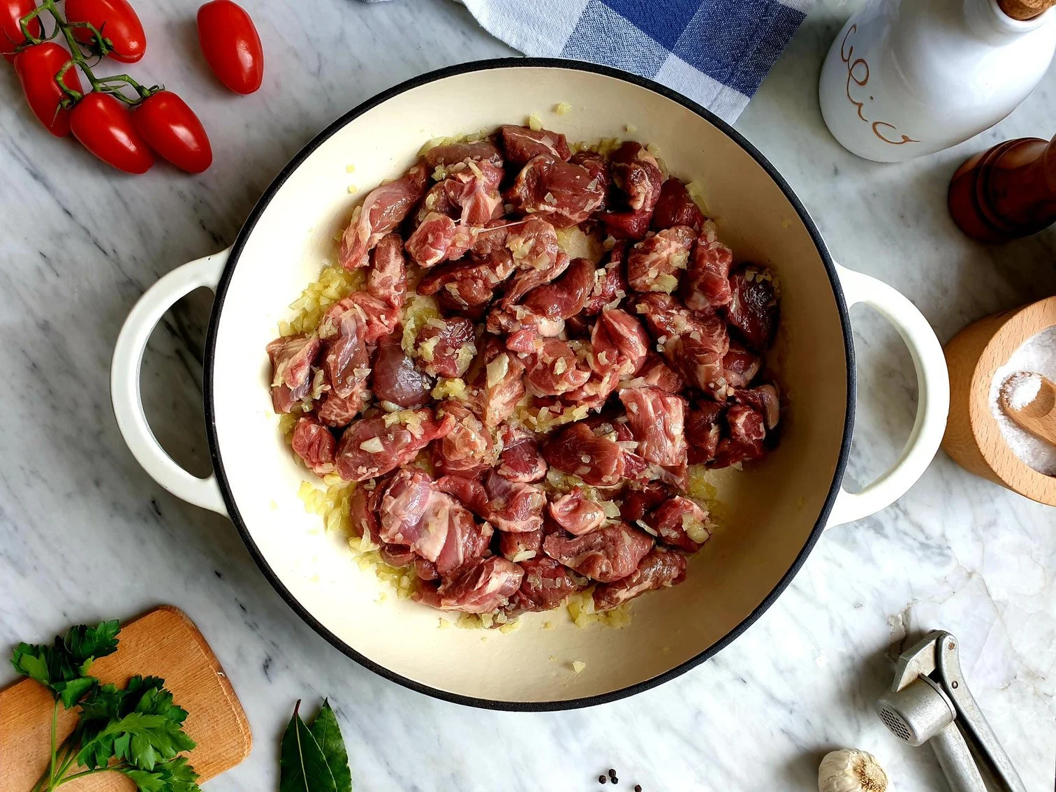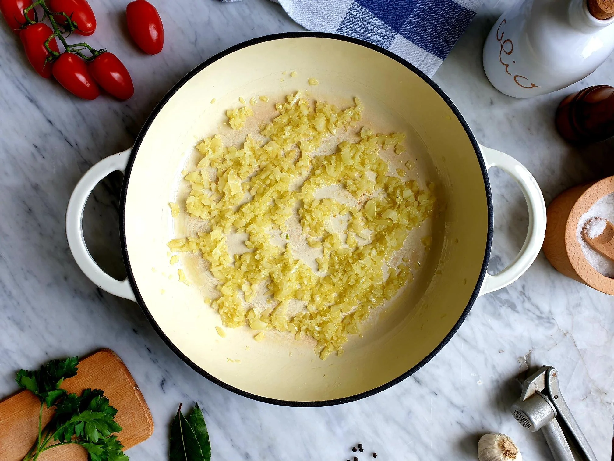 Add finely chopped onions and cook on a medium-law heat until the onions are translucent and soft. Add crushed garlic and cook together with the onions for a minute or so stirring constantly in order to avoid garlic burning.