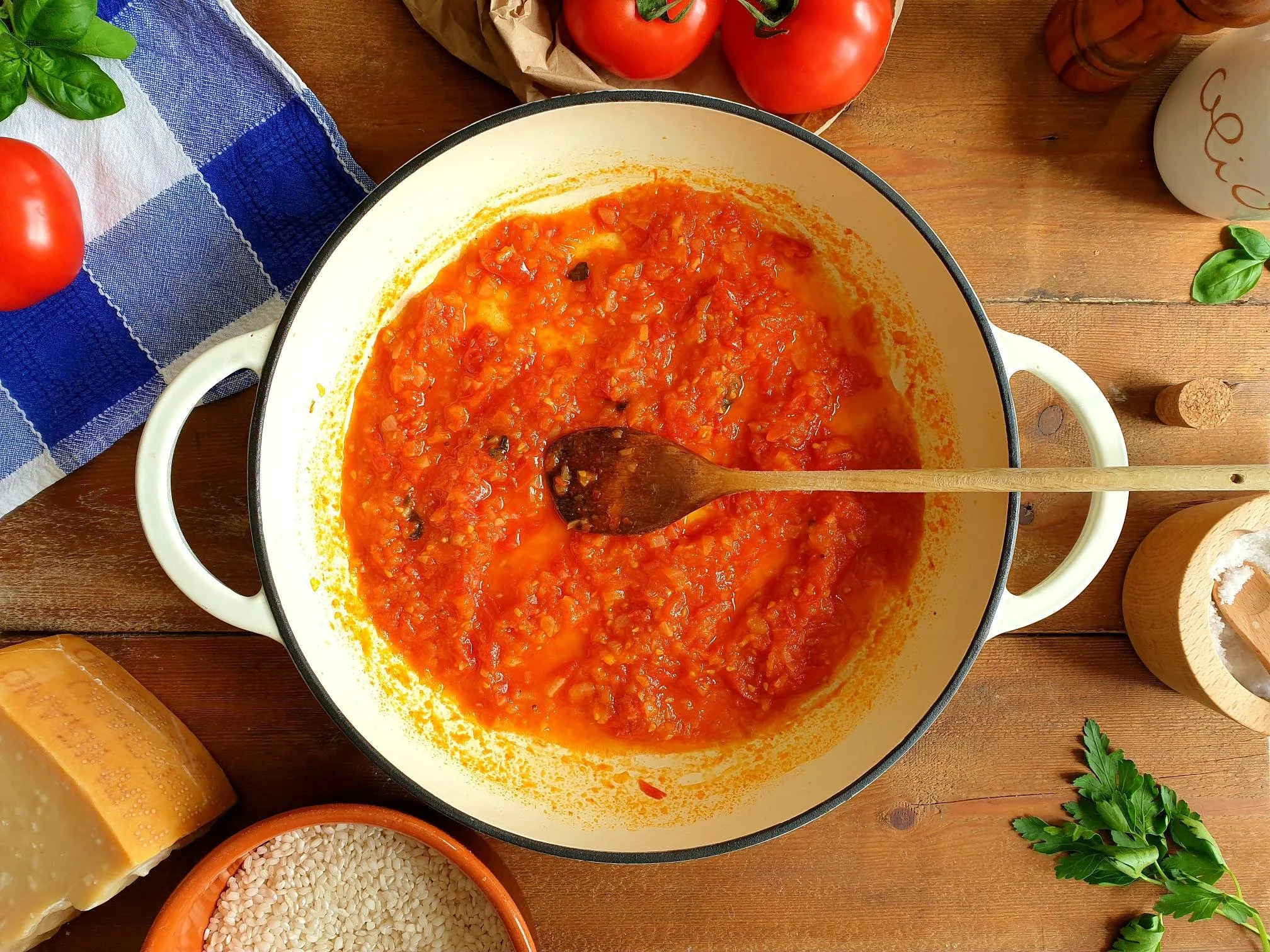 During the cooking give a pan a little shake now and again. Taste the sauce and adjust the seasoning. If the sauce is too thick just add a splash of water or, on the contrary, if you think the sauce is too thin, add a pinch of breadcrumbs.
