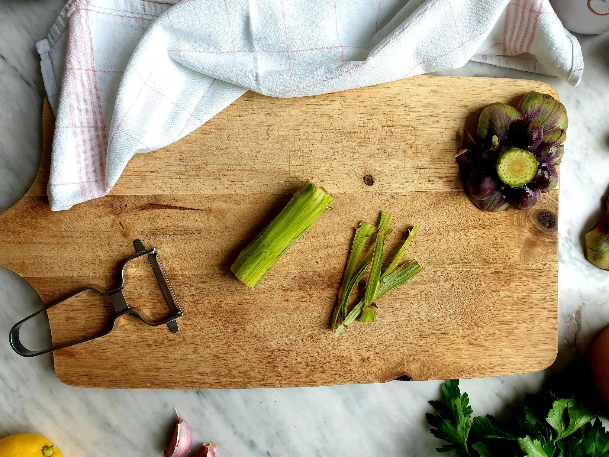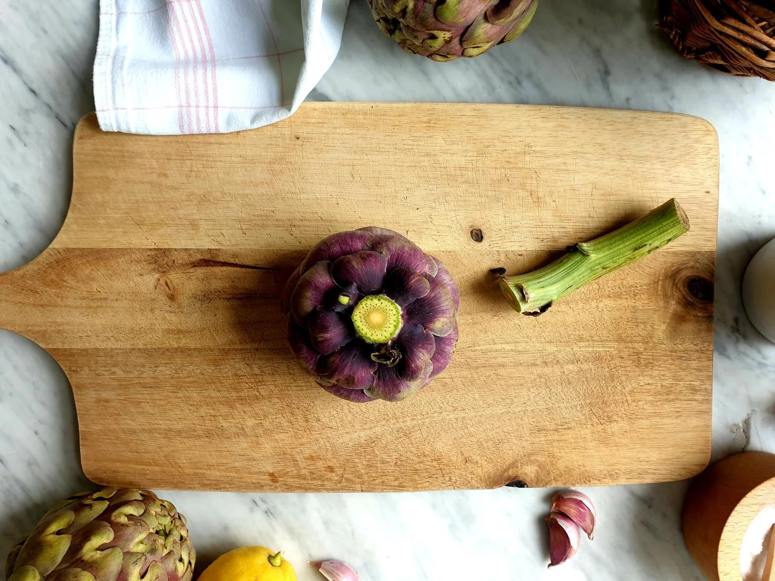 Trim off the stem of the artichoke so it can stand and sit upright without rolling over. Put the stem in the acidulated water and set aside for later use.