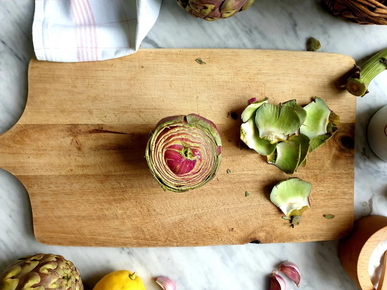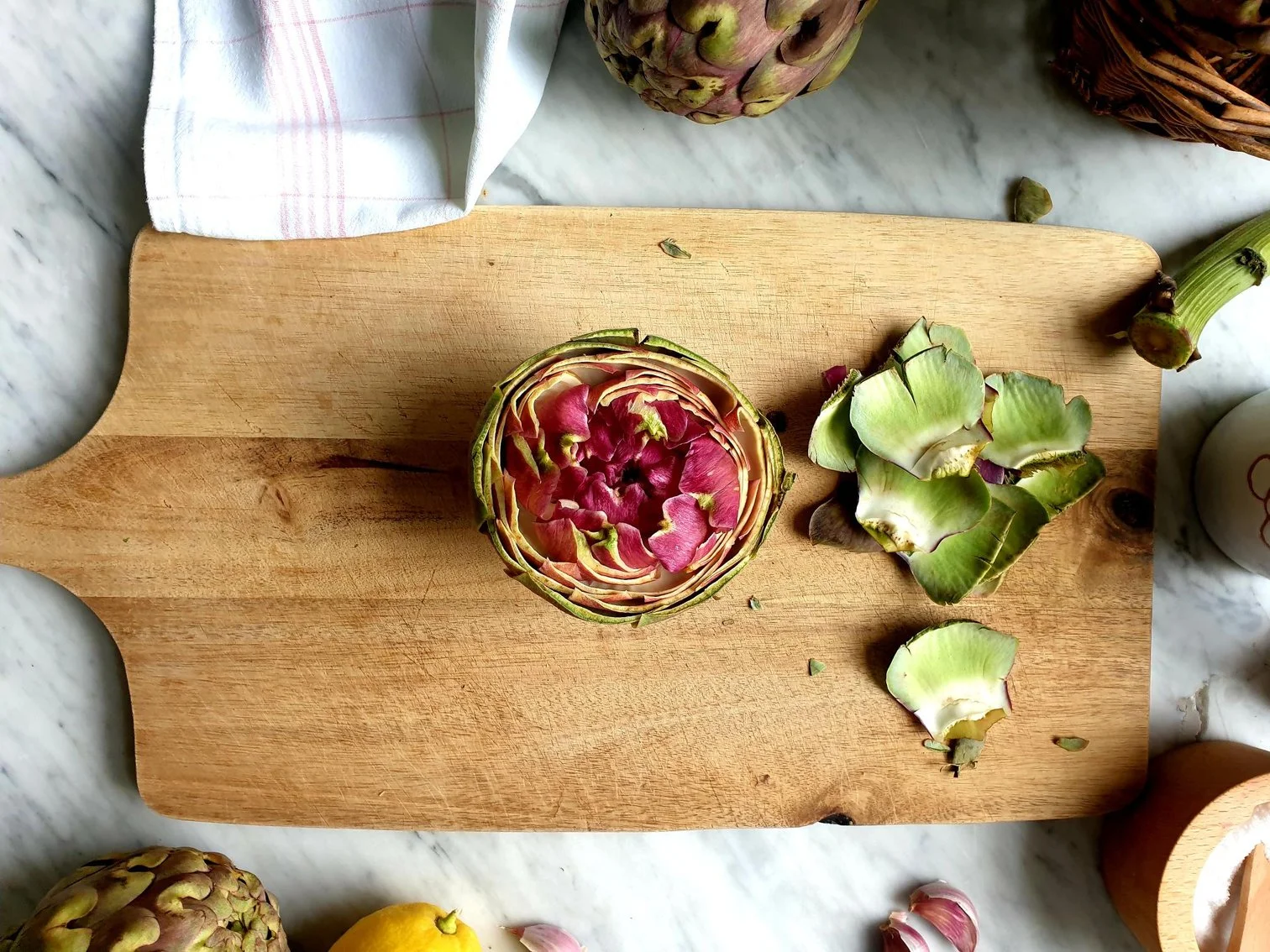 Rub the base of the artichoke with a lemon half, this will prevent from turning it brown.