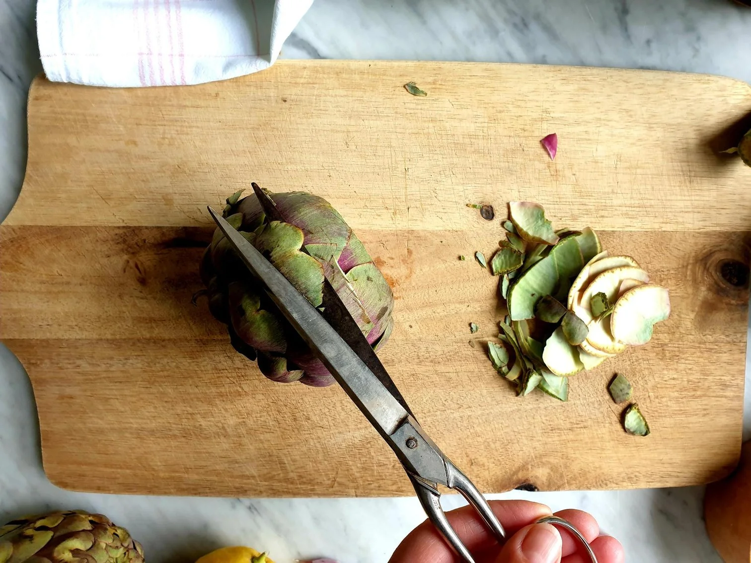 With the sharp knife cut off the tip of the artichoke, about 2-3cm (1inch).