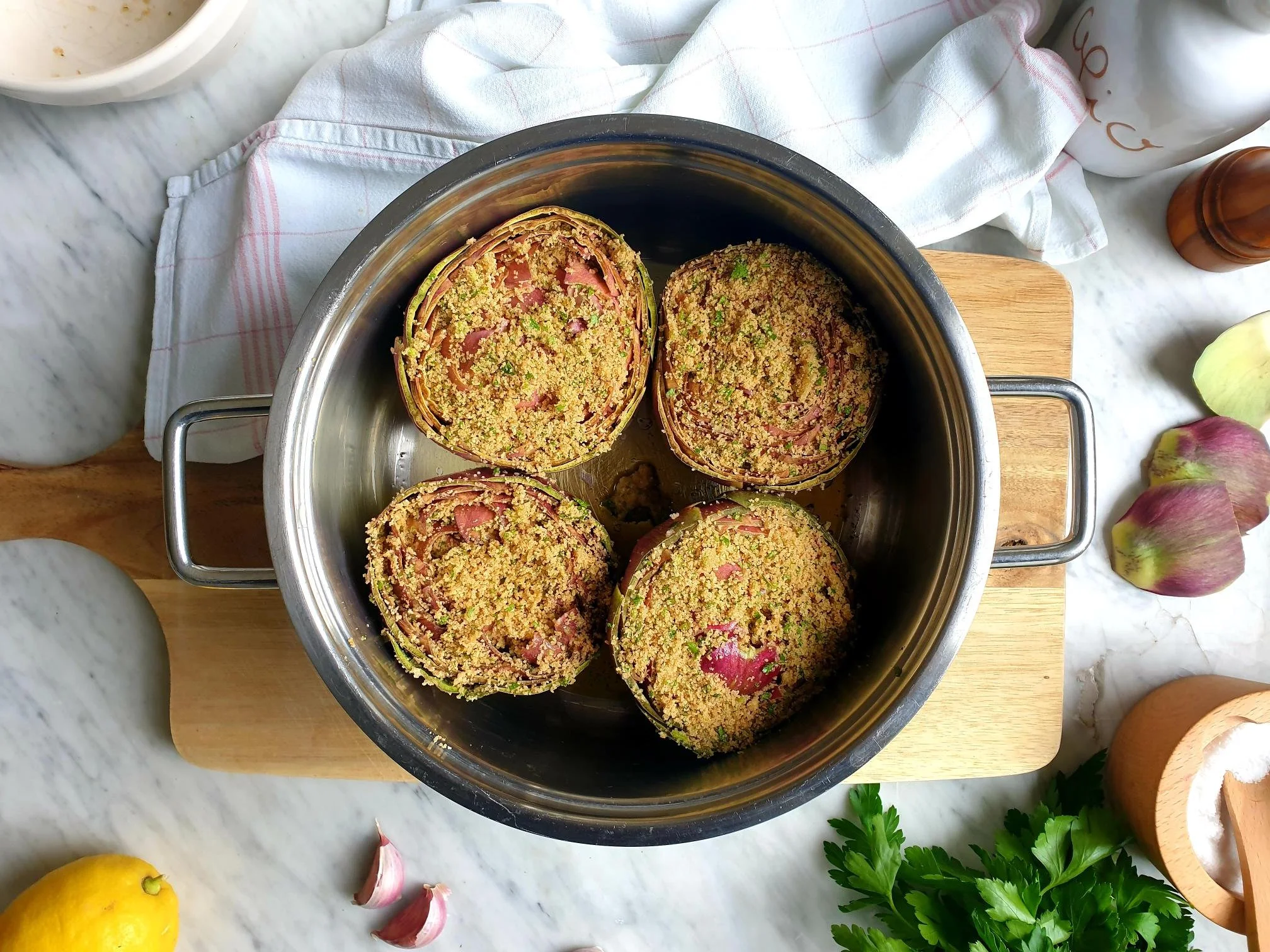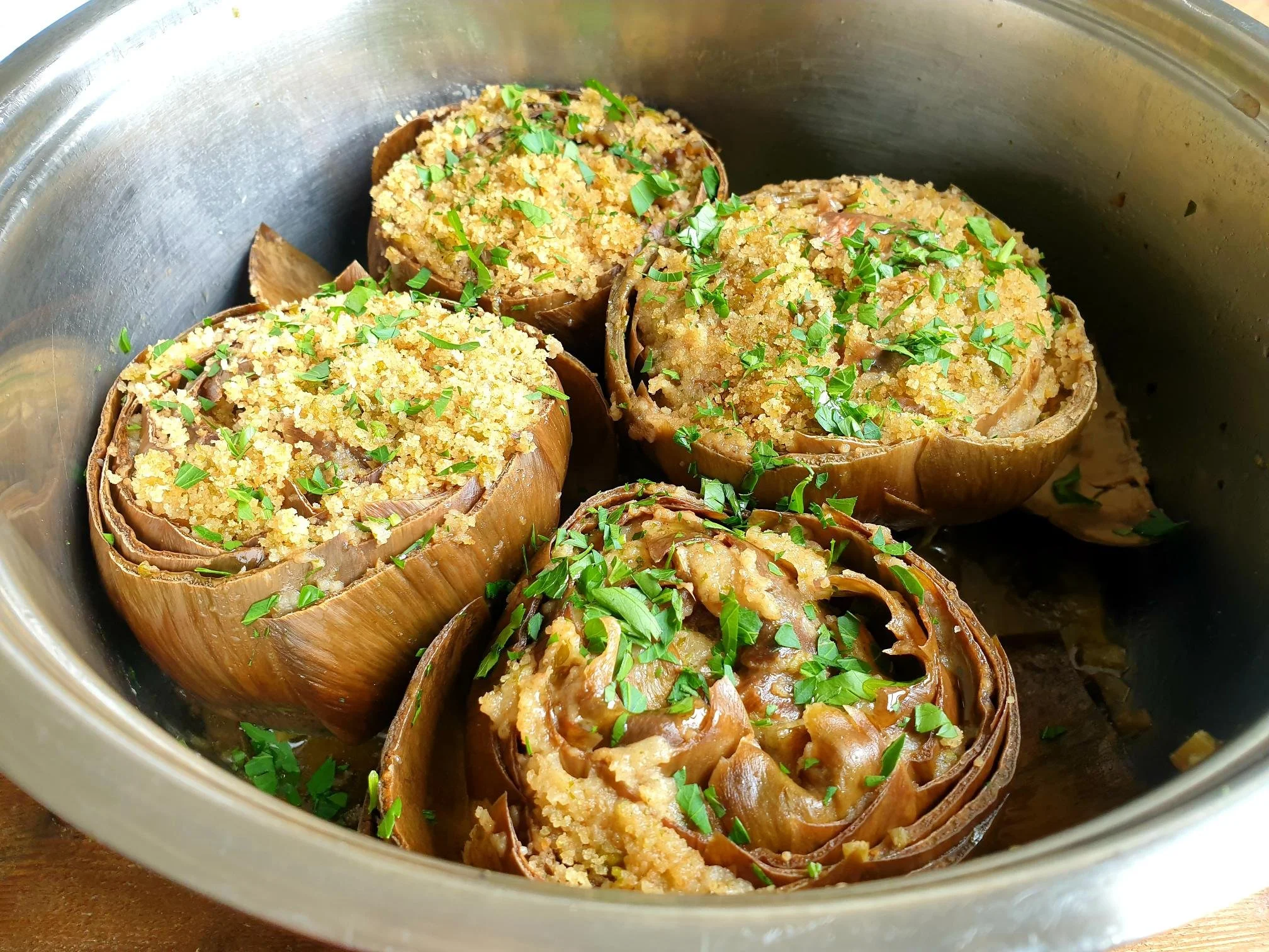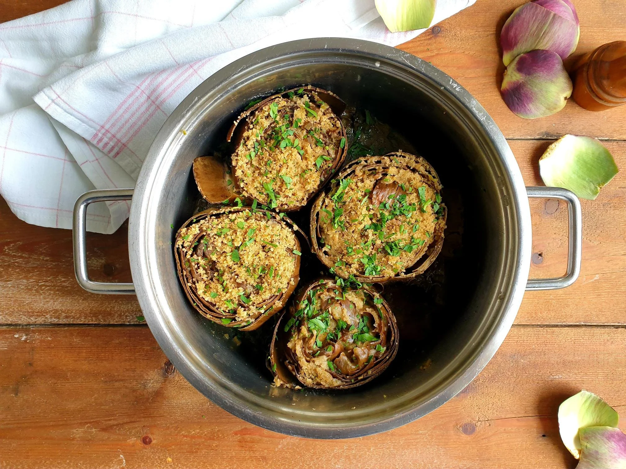 This dish is rustic and informal, artichokes are trimmed and stuffed with garlicky breadcrumbs, then cooked in a saucepan until tender.