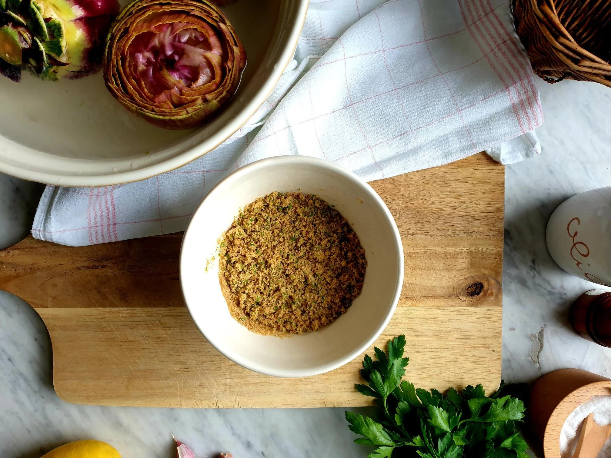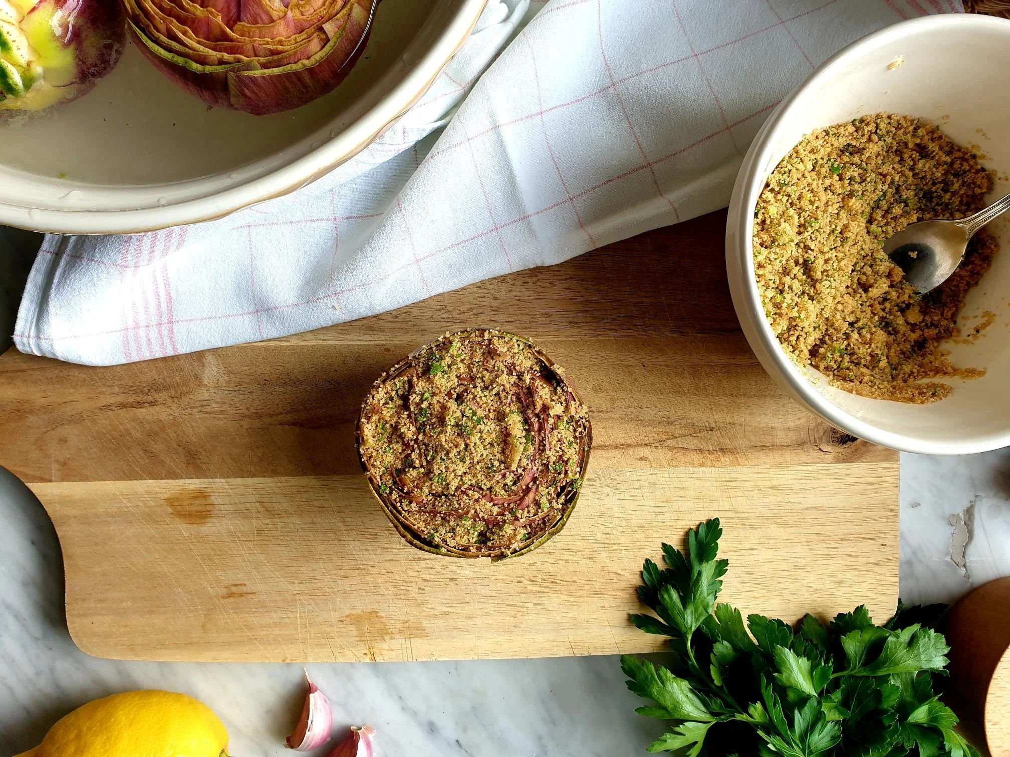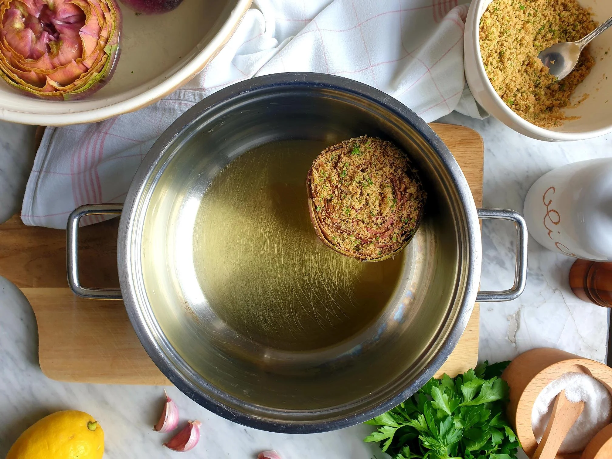 This dish is rustic and informal, artichokes are trimmed and stuffed with garlicky breadcrumbs, then cooked in a saucepan until tender.