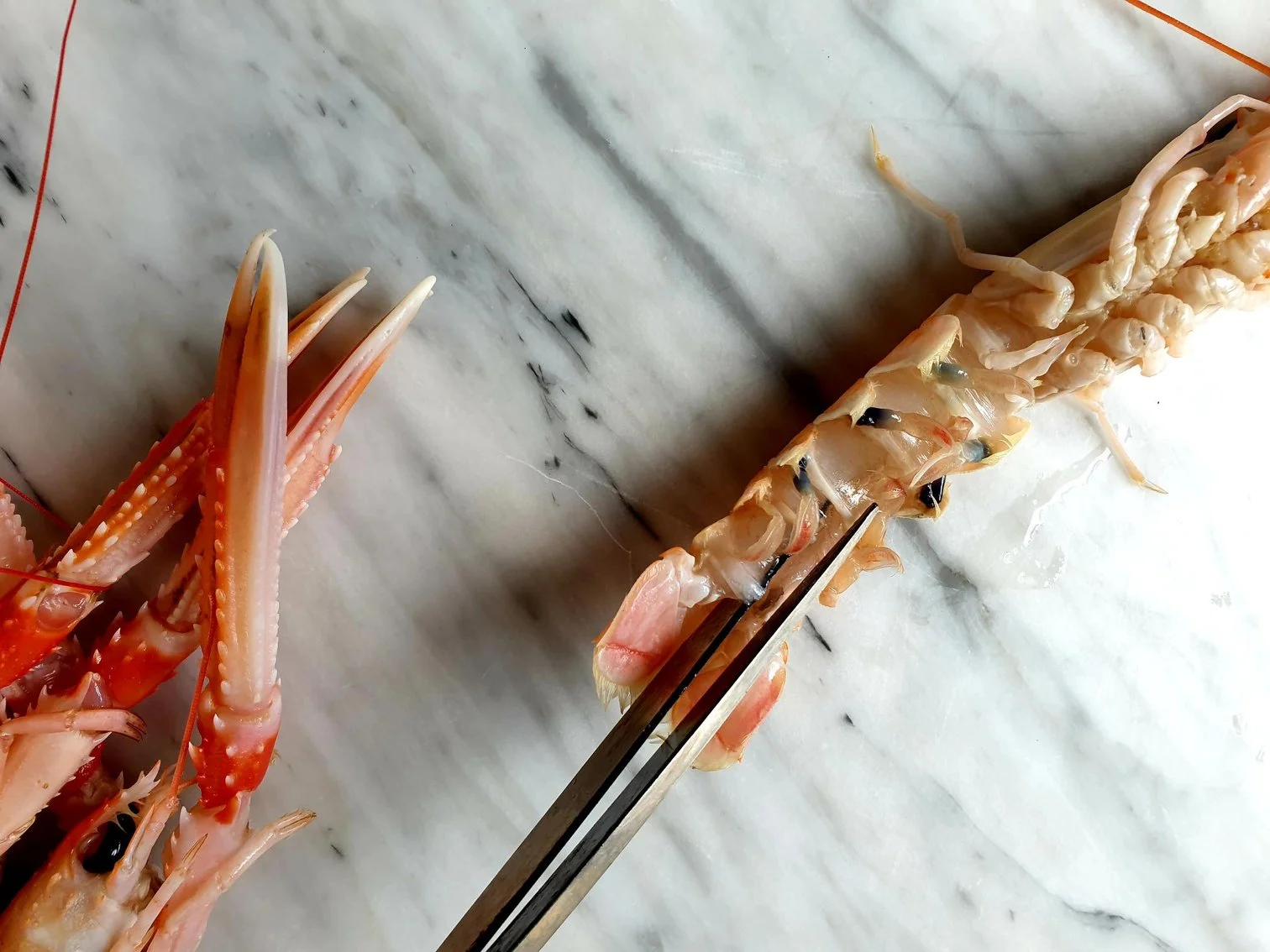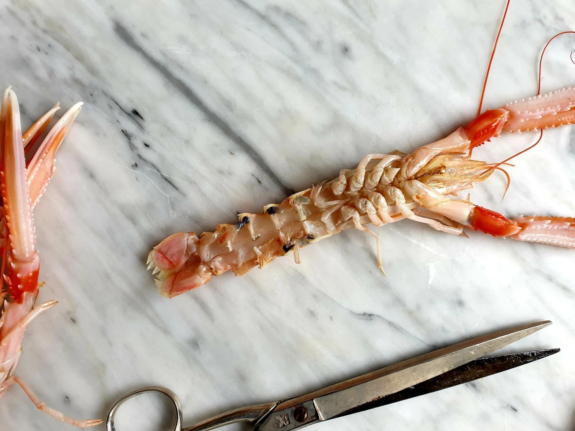 Take a pair of kitchen scissors and one individual langoustine in your hand, turn it upside down, facing the soft shell side of the tail towards you. Insert the scissors at the bottom of it and cut through along the length of the entire tail.