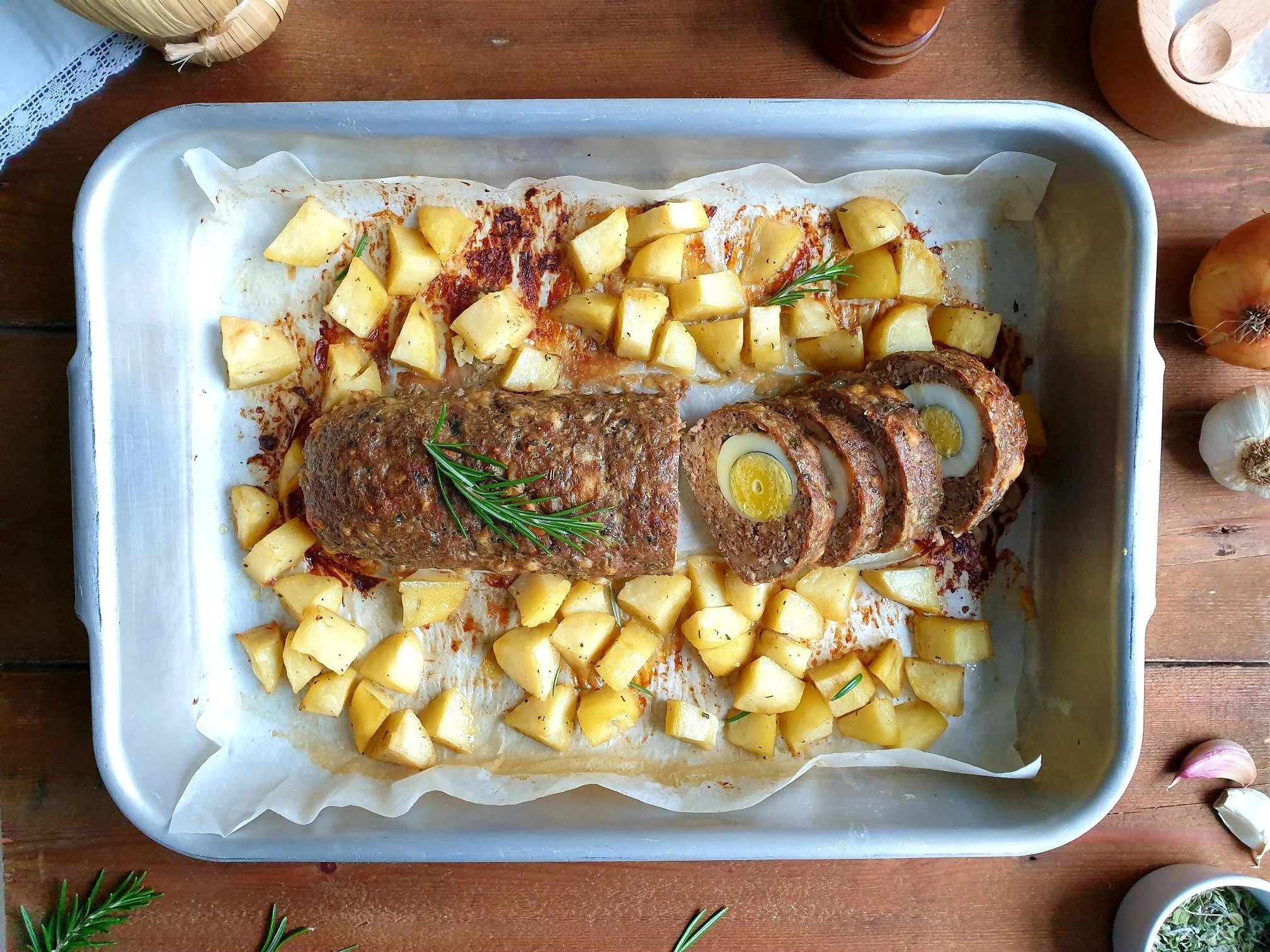 mince beef, mince pork, hard boiled eggs, Meatloaf, Festive Meatloaf, Christmas meatloaf, Polpettone, Polpeton, stale bread, old bread, Oven baked potatoes, Potatoes, picnic food, sandwich filler, meat starter