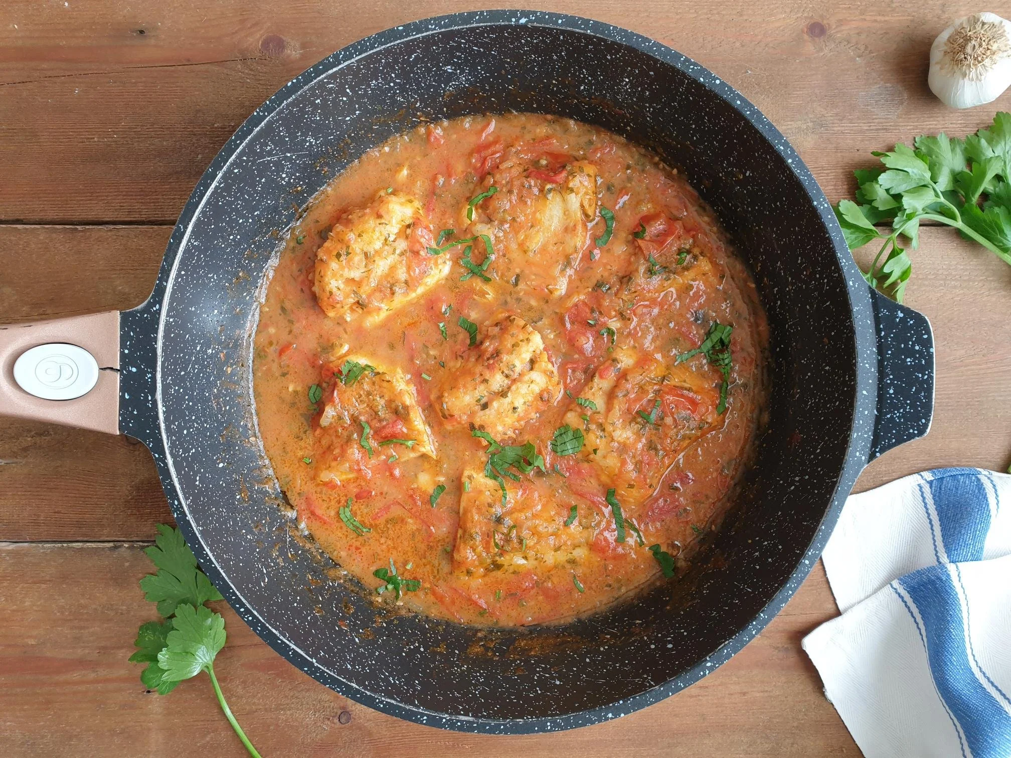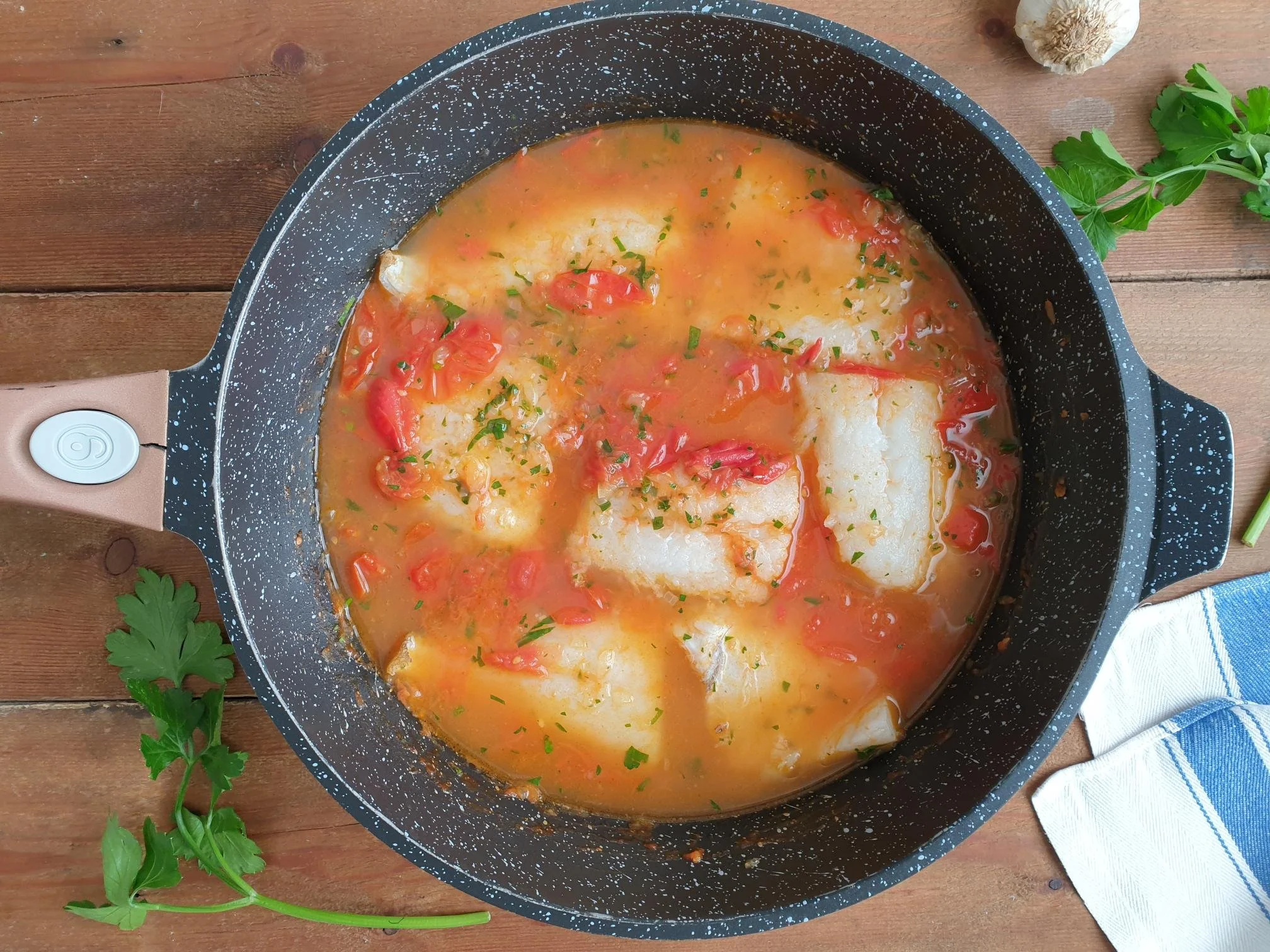 Place cod pieces in a tomato sauce, add finely chopped parsley and enough water to almost cover the cod fillets. If using fresh cod add the water half way up as it cooks quicker.